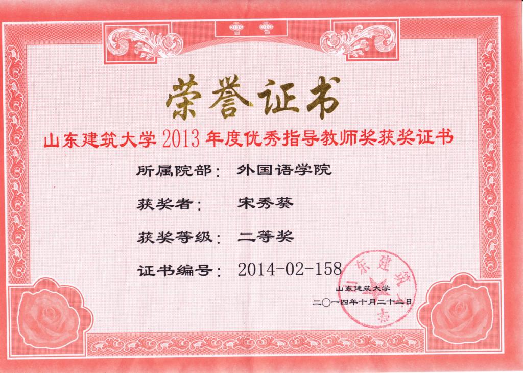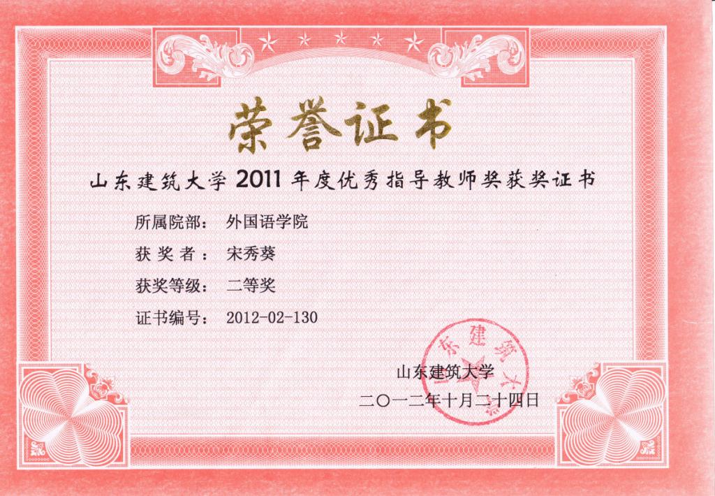 宋秀葵院长荣获山东建筑大学2011年度优秀指导教师二等奖。