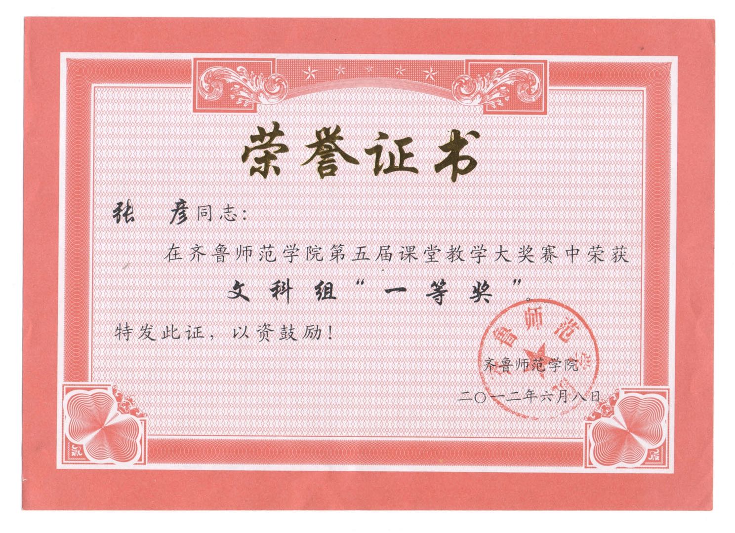 张彦老师在2012齐鲁师范学院第五届课堂教学大奖赛中荣获文科组“一等奖”。