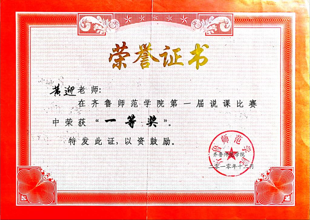 黄迎老师在2012齐鲁师范学院第一届说课比赛中荣获“一等奖”。