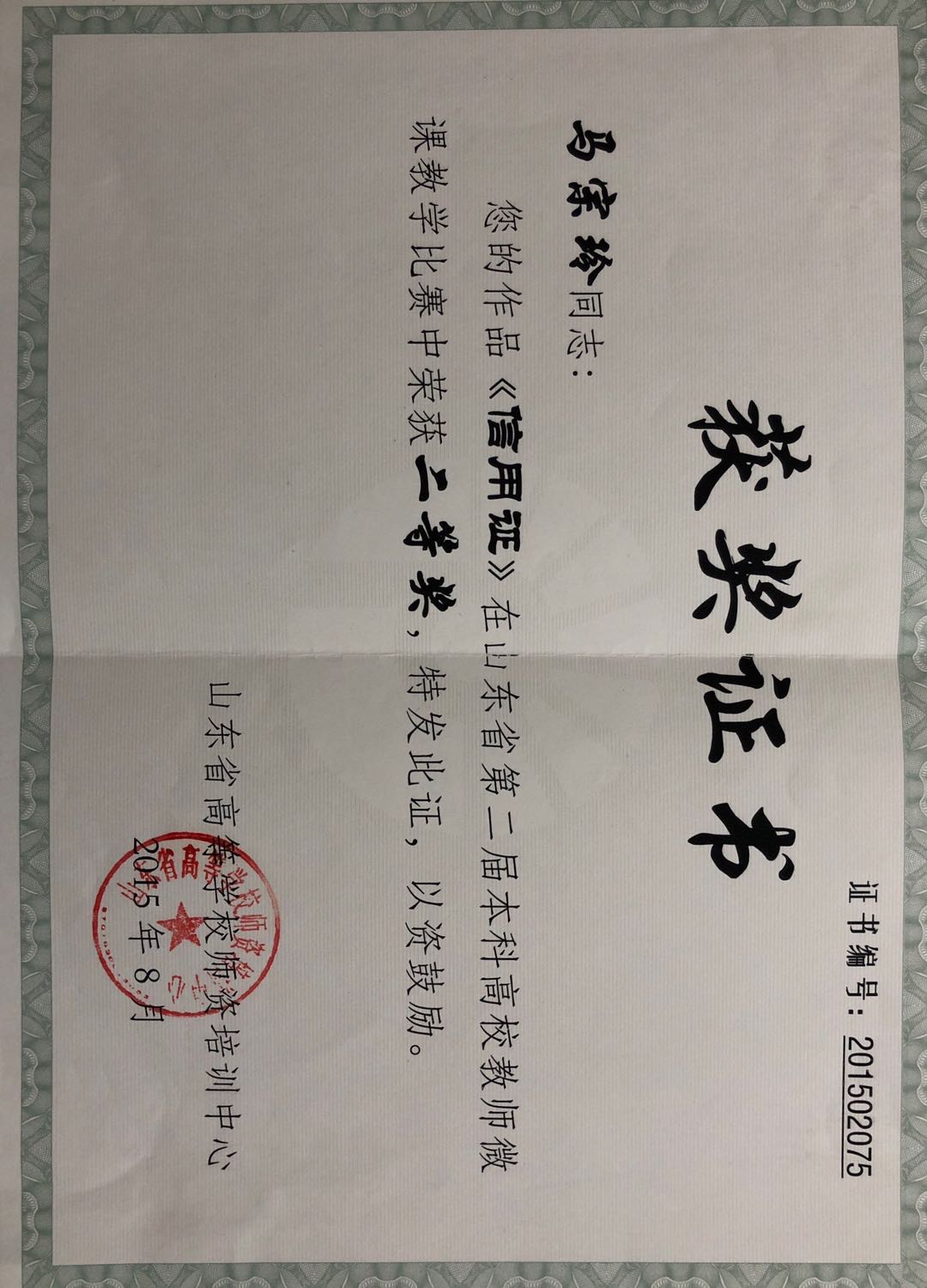 马宗玲老师在2015年山东省第二届本科高校教师微课教学比赛中作品《信用证》荣获二等奖。