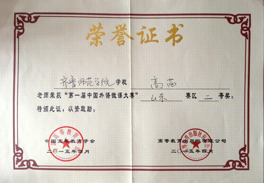 高苗老师在2015年“第一届中国外语微课大赛”中荣获山东赛区二等奖。