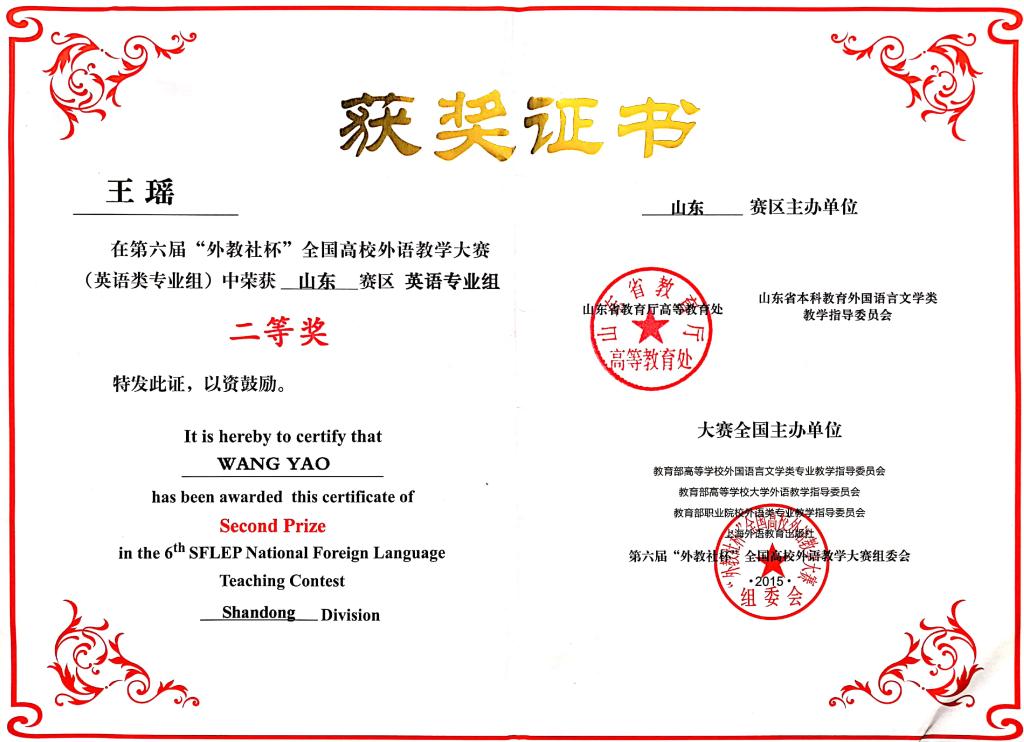 王瑶老师在2015第六届“外教社杯”全国高校外语教学大赛(英语类专业组)中荣获山东赛区英语专业组二等奖。