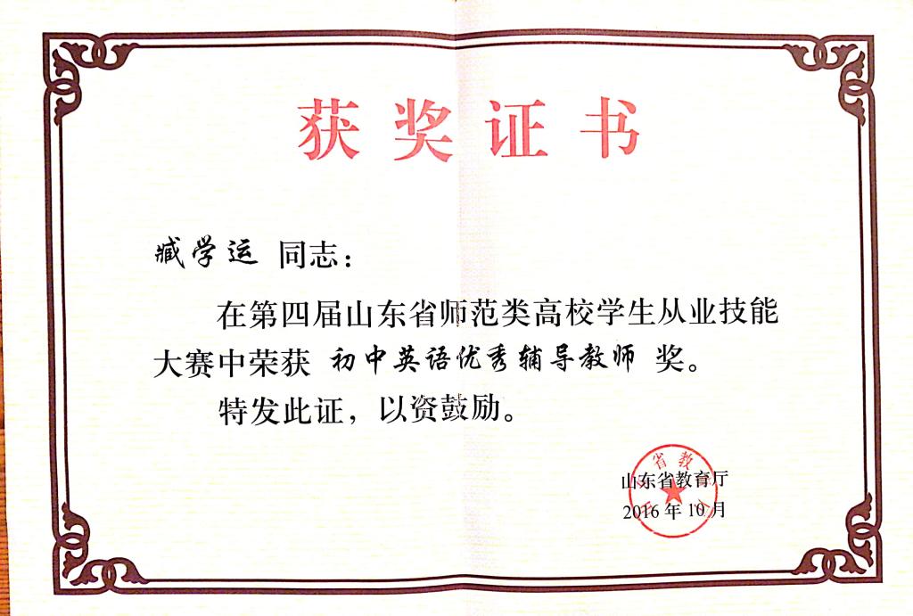 臧学运老师2016在第四届山东省师范类高校学生从业技能大赛中荣获初中英语优秀辅导教师奖。