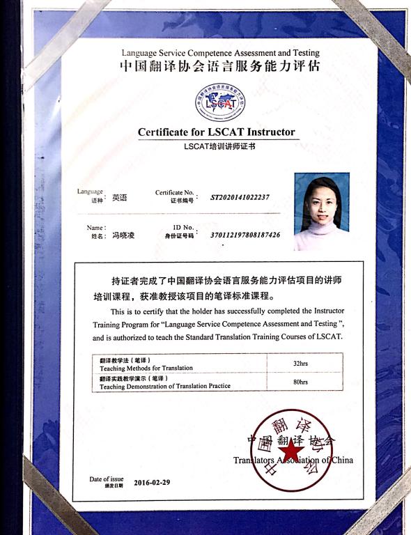 冯晓凌老师2016完成了中国翻译协会语言服务能力评估项目讲师培训课程,获准讲授该项目的笔译标准课程。