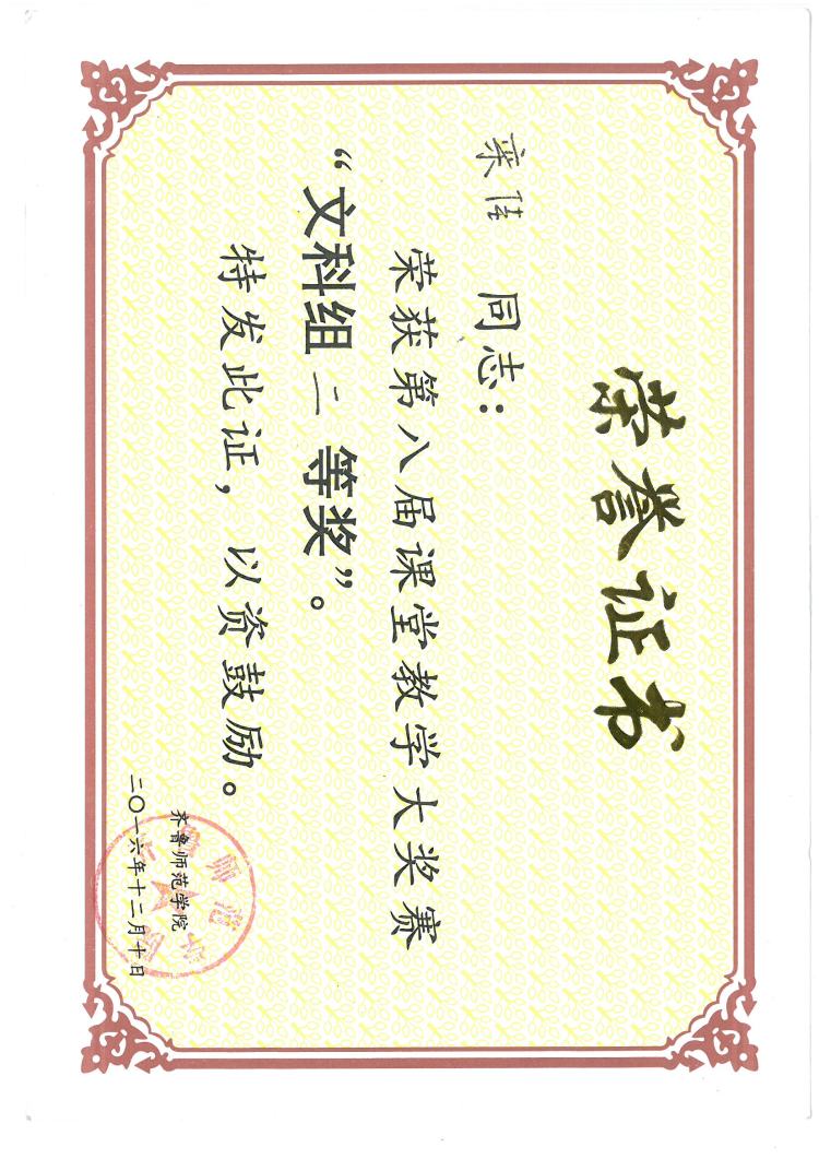 栾佳老师2016年荣获齐鲁师范学院第八届课堂教学大奖赛二等奖。