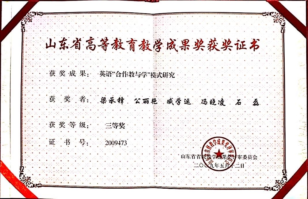 梁承锋、公丽艳、臧学运、冯晓凌、石磊老师的作品英语“合作教与学”模式研究2009荣获山东省高等教育教学成果三等奖。