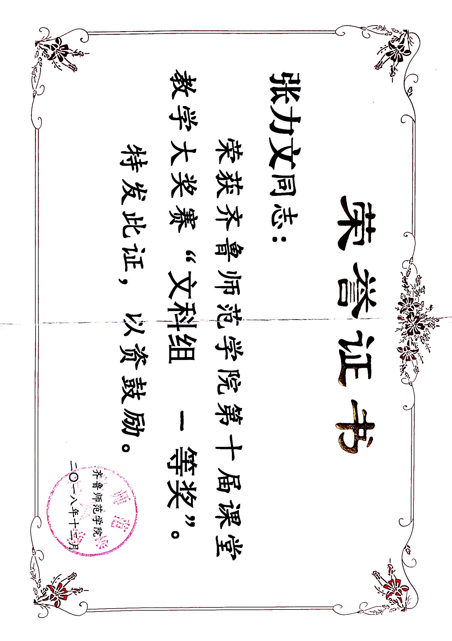 张力文老师在2018齐鲁师范学院第十届课堂教学大奖赛中荣获文科组“一等奖”。