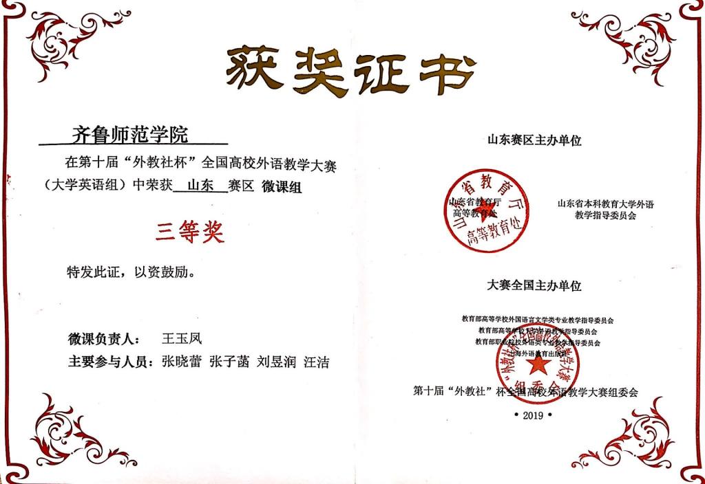 王玉凤老师在2019“全国高校教师教学创新大赛——第五届外语微课大赛”中荣获山东赛区三等奖。