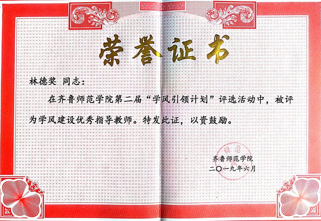 林德奖老师在2019齐鲁师范学院第二届“学风引领计划”评选活动中荣获学风建设优秀指导教师荣誉称号。