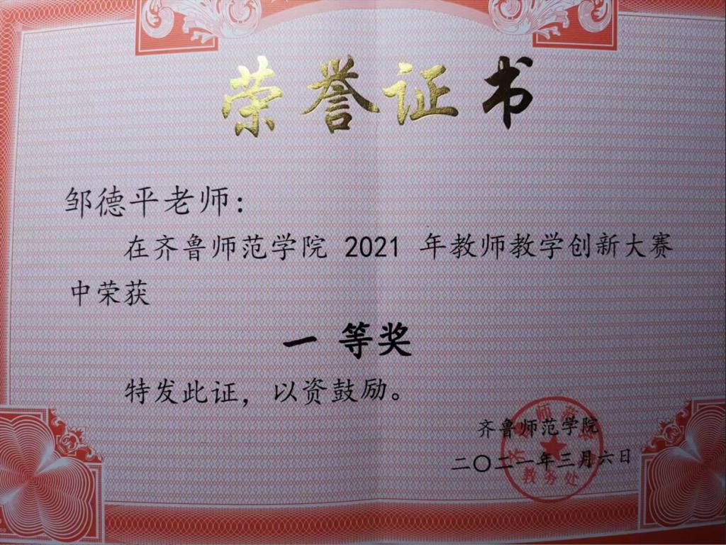 邹德平老师在齐鲁师范学院2021年教师教学创新大赛中荣获一等奖。