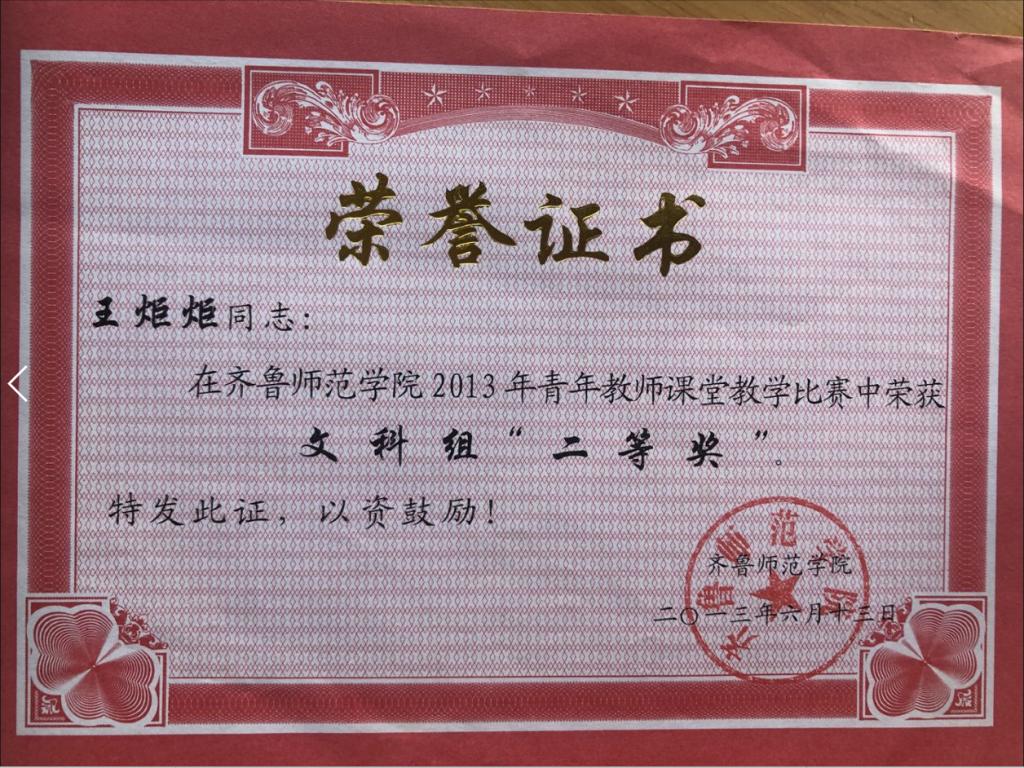 王炬炬老师2013年 荣获齐鲁师范学院青年教师教学大赛二等奖。