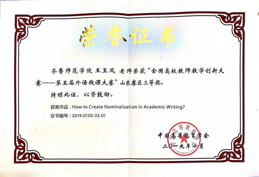 齐鲁师范学院王玉凤老师荣获2019年“全国高校教师教学创新大赛---第五届外语微课大赛“山东赛区三等奖。