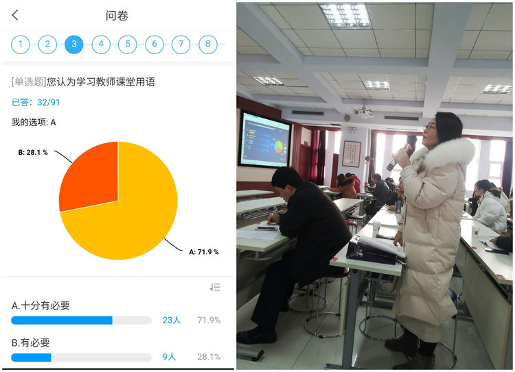 首先,张老师亲自制作了一份关于英语课堂用语的调查问卷,现场用一种更加真实有效的方法拉近了我们之间的距离,走进了英语教师思维生活之中。毋庸置疑,教师课堂用语在教师心中有着极为重要的地位,今天的知识大宴就此拉开序幕。