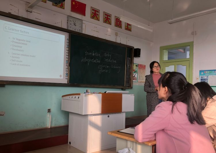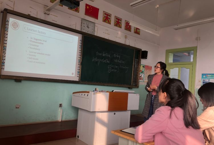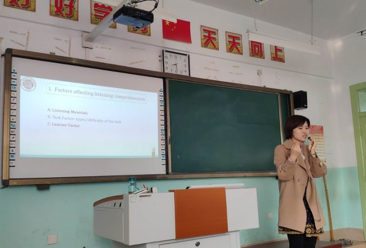 作为难得一见的男英语老师,林德奖老师给课堂带来了一次崭新的体验。上午他带领老师们复习了上一阶段的语音知识,接着提出了本次的教学重点:视听教学,提高听力水平。林老师说听力技能的提高要日积月累,要多模仿,跟读,背诵,听录音时先不要看文本,要注重学生学习兴趣的培养。