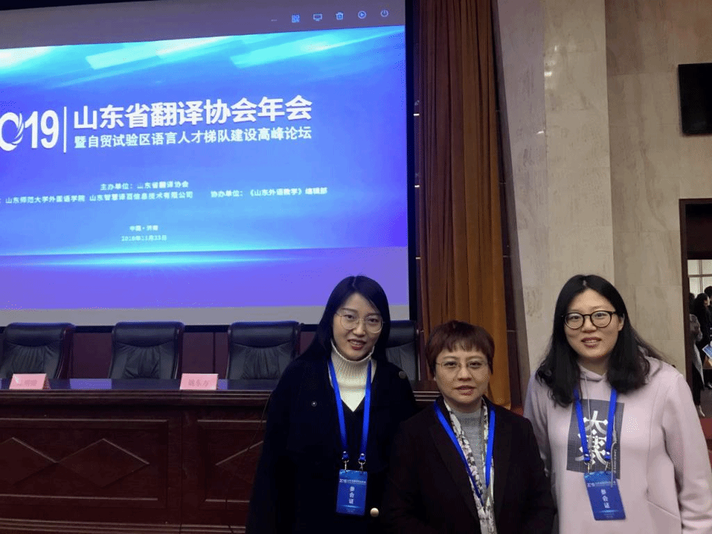 2019年11月23日,由山东省翻译协会主办,山东师范大学外国语学院和山东智慧译百信息技术有限公司承办的2019山东省翻译协会年会暨自贸试验区语言人才梯队建设高峰论坛在山东师范大学隆重举行,齐鲁师范学院外国语学院院长宋秀葵、教师赵宇、刘昱润参与了此次年会。