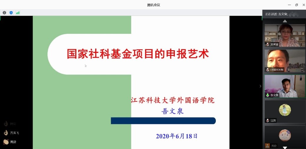 6月18日晚,外国语学院特邀江苏省“青蓝工程”中青年学术带头人吾文泉教授开展了题为“国家社科基金项目的申报艺术”的学术报告。报告由外国语学院副院长(主持工作)宋秀葵主持,副院长李百温及全体教师聆听了本次报告。