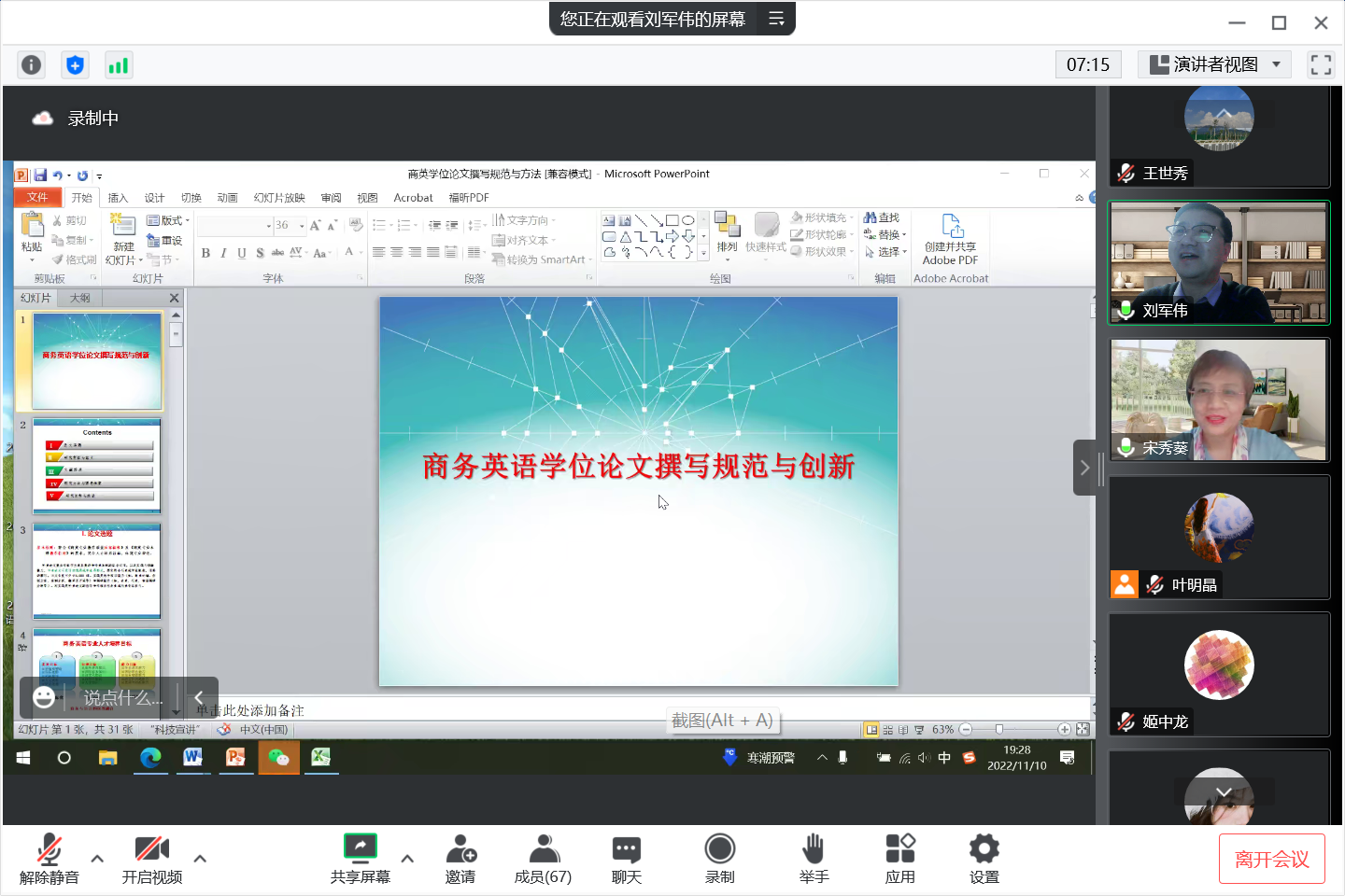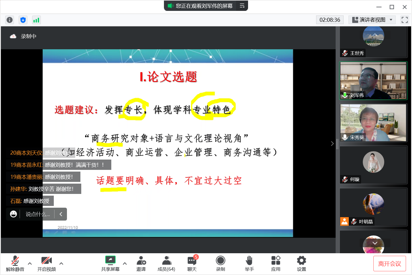为助力学生了解学位论文写作规范,提升学位论文写作质量,11月10日晚,外国语学院特邀西安外国语大学刘军伟教授开展了“商务英语学位论文撰写规范与创新”的线上讲座。讲座由外国语学院院长宋秀葵主持,商务英语专业全体任课教师和商务英语专业本科生参加了讲座。
