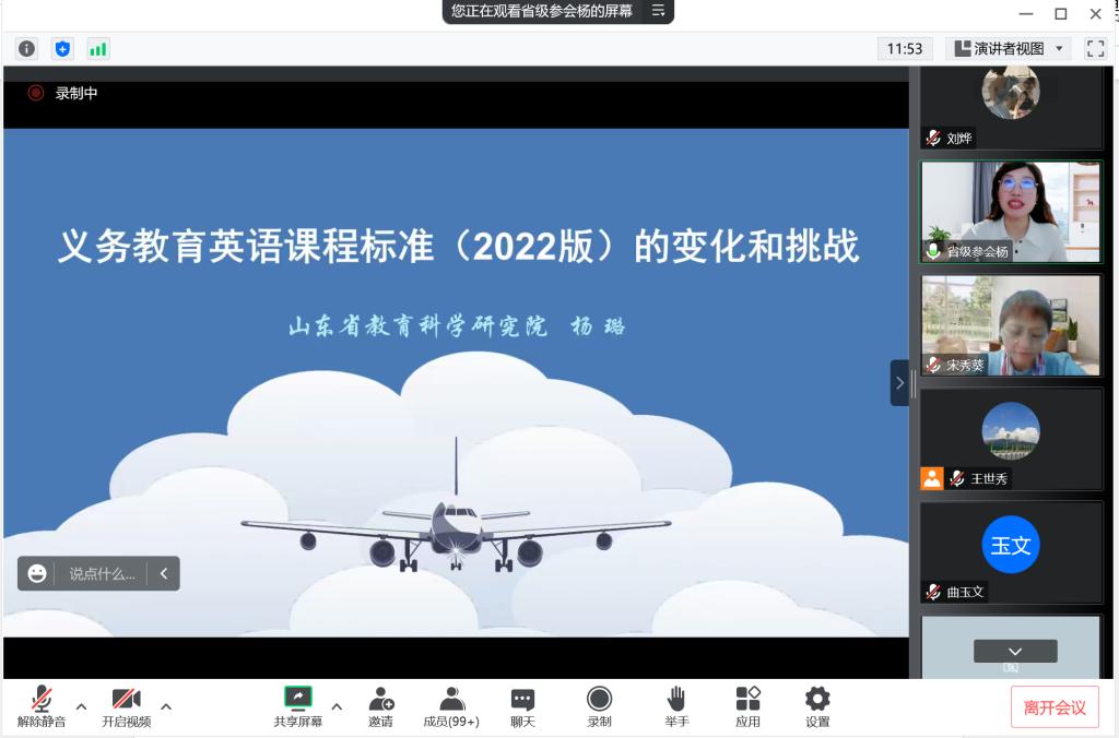 5月8日晚,外国语学院特邀山东省教育科学研究院教育评估所副所长、小初高中校本课程教研员、正高级教师、国培专家库专家杨璐开展了题为“义务教育英语新课标的变化与挑战”的线上讲座。本次讲座由外国语学院院长宋秀葵主持,外国语学院全体任课教师、2020级和2021级英语专业师范类全体学生、学院实习基地东阿实验中学和章丘中学的英语教师参加。