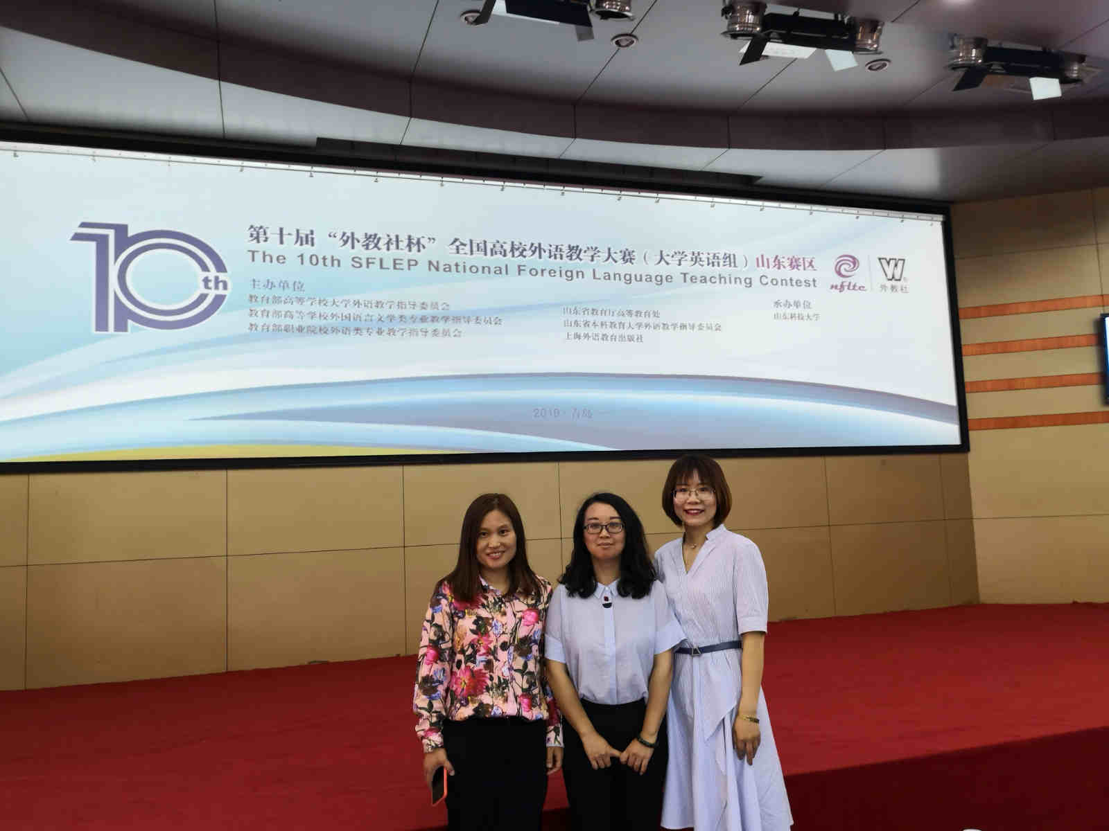 5月18日-19日,由山东省教育厅高等教育处、山东省本科教育外国语言文学类教学指导委员会和上海外语教育出版社共同主办、山东科技大学承办的第十届“外教社杯”全国高校外语教学大赛山东赛区比赛在青岛举行。比赛分为综合课组、(视)听说课组和微课组三个组别,共有来自全省53所高校85名教师参加了综合课组和(视)听说课组的比赛,有41所高校组队205名教师参加了微课组的比赛。我校英语教师喜获二等奖2项、三等奖1项。其中,张力文老师获得大学英语(视)听说课组二等奖、邹德平老师获得综合课组二等奖、王玉凤老师带领的微课团队(张晓蕾,张子菡,刘昱润和汪洁)获得微课组三等奖。