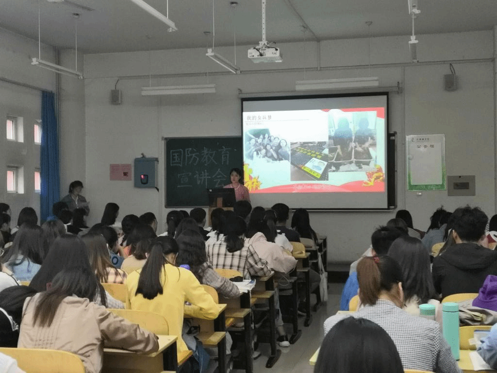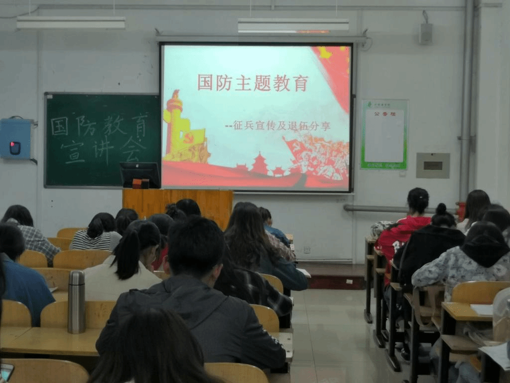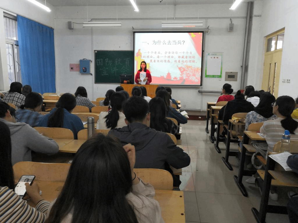 为纪念五四运动100周年,加强爱国主义教育,响应国家征收适龄大学生入伍的号召,外国语学院于周四15:40、晚18:30分别在一教A121和一教A106教室举办了国防教育宣讲会,主讲人为两位退伍学生穆红丽、梁甘霖,她们在讲述她们的军旅生活同时为征兵和国防教育作宣传,参加此次活动的有17级、18级全体学生。会议由学习部成员主持。