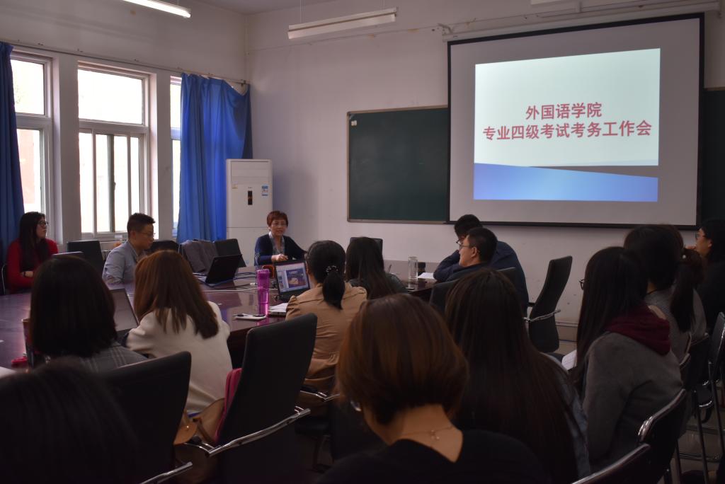 4月18日下午,外国语学院在学院会议室召开“英语专业四级考试考务会”,由学院办公室主任栾毅之主持,副院长宋秀葵(主持工作)、臧学运、所有考务人员及监考老师参加了此次会议。