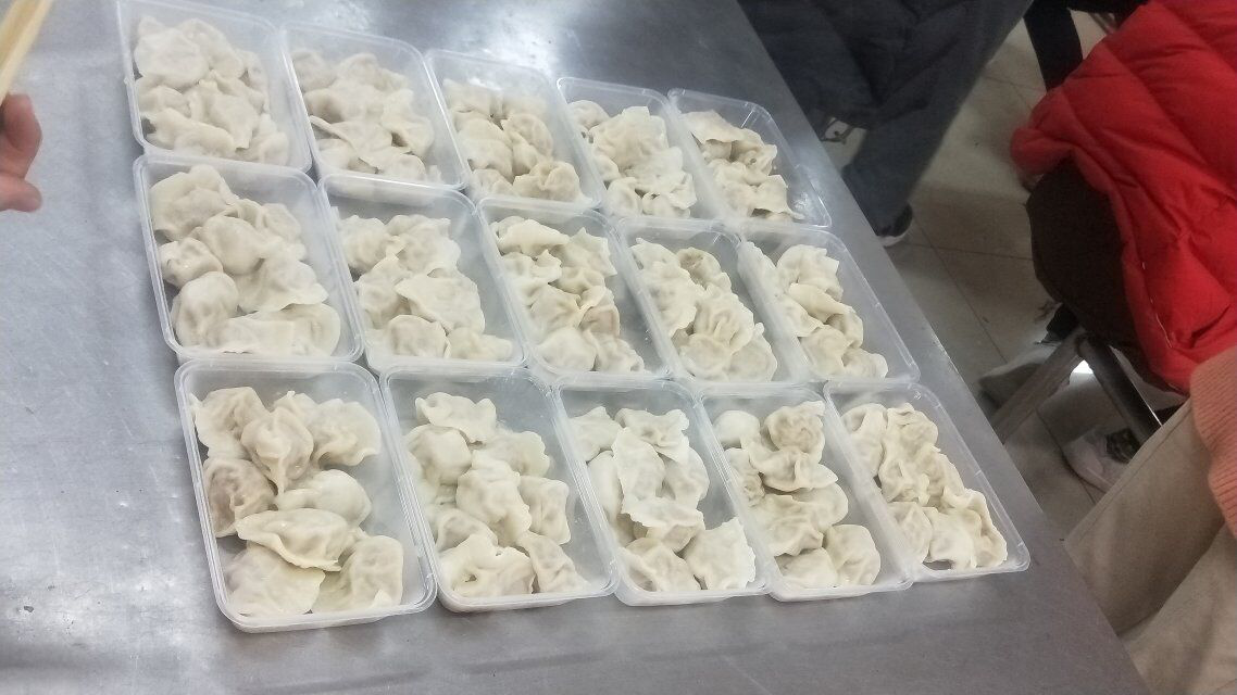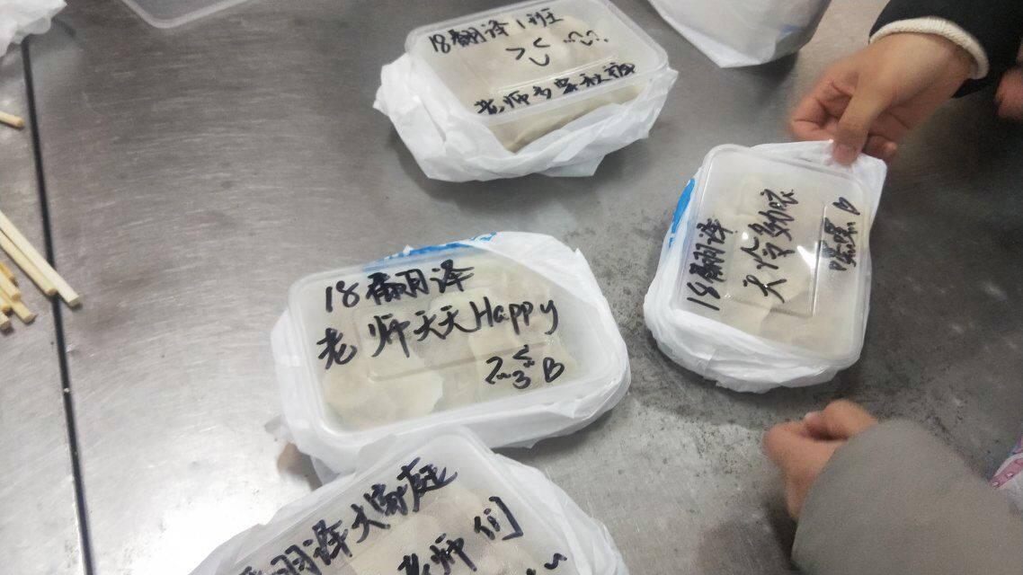 活动开始前,由组织委员付文霞、生活委员解祥敏及翻译班全体男生们采购了食材。材料齐全,团支书于浩杰则带领其他六名同学进行了包饺子活动,同学们个个手法熟练,气氛活跃,不禁吸引了食堂工作人员以及其他就餐同学的目光。包饺子工序全部完成后,在食堂工作人员的帮助下,饺子很快新鲜出炉。