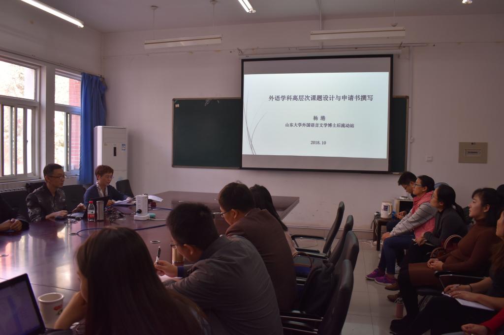 10月11日下午,外国语学院“东西君”学术讲堂在学院会议室举行。本次学术讲座的嘉宾是临沂大学特聘教授、临沂大学外国语学院杨港博士。杨港教授于2014年获得上海外国语大学英语语言文学博士学位,为山东大学外国语言文学博士后、曾公派至英国利物浦大学访学,现在还不满四十岁,已经主持了国家社科基金一般项目、教育部人文社科研究青年基金项目、中国博士后科学基金面上资助项目、国家语委科研基地项目、山东省社科规划研究项目等14项课题,出版2部专著,发表CSSCI来源期刊论文5篇、其他高质量论文10多篇,成果获得山东省高等教育教学成果二等奖、山东省社会科学优秀成果三等奖等荣誉。