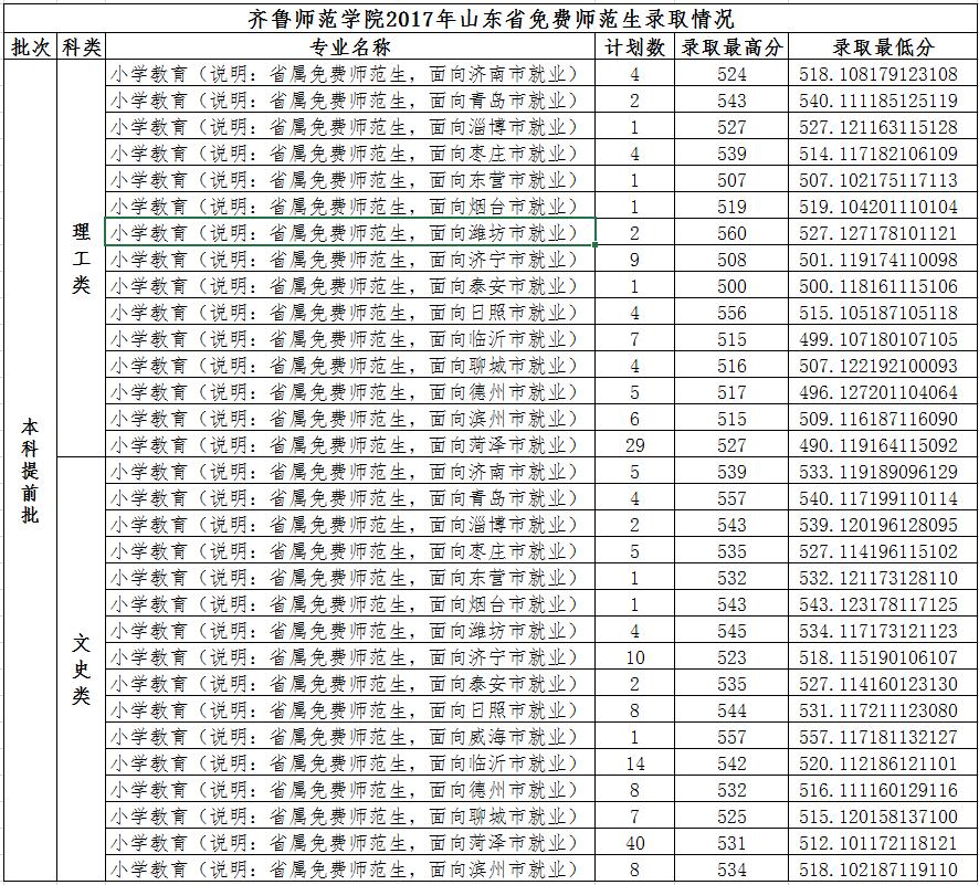 齐鲁师范学院2017年山东省免费师范生录取情况