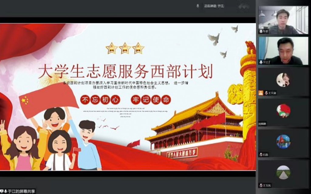 为使学生们更全面地了解西部计划,做好西部计划宣传与招募工作,引导和鼓励优秀大学生参与到建设西部中去,2022年5月12日晚,外国语学院开展了“最美青春 绽放西部”志愿服务西部计划宣讲会。党委书记于江,团总支书记牛荦以及2021届毕业班部分同学参加了本次活动。