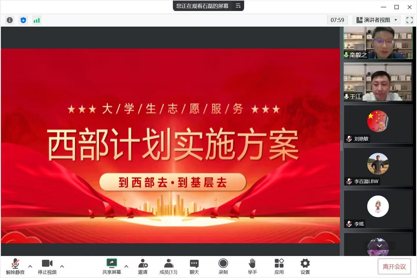 为进一步深化实施大学生志愿服务西部计划项目,引导和鼓励更多优秀的毕业生以志愿之名,赴西部之约,2022年3月15日,外国语学院外国语学院以线上的形式召开了“志愿传承奉献青春”西部计划教育主题活动。参与活动人员有外国语学院党委书记于江,党委副书记栾毅之,石磊老师及2018级本科班、2019级专科班以及20级专升本班部分学生。