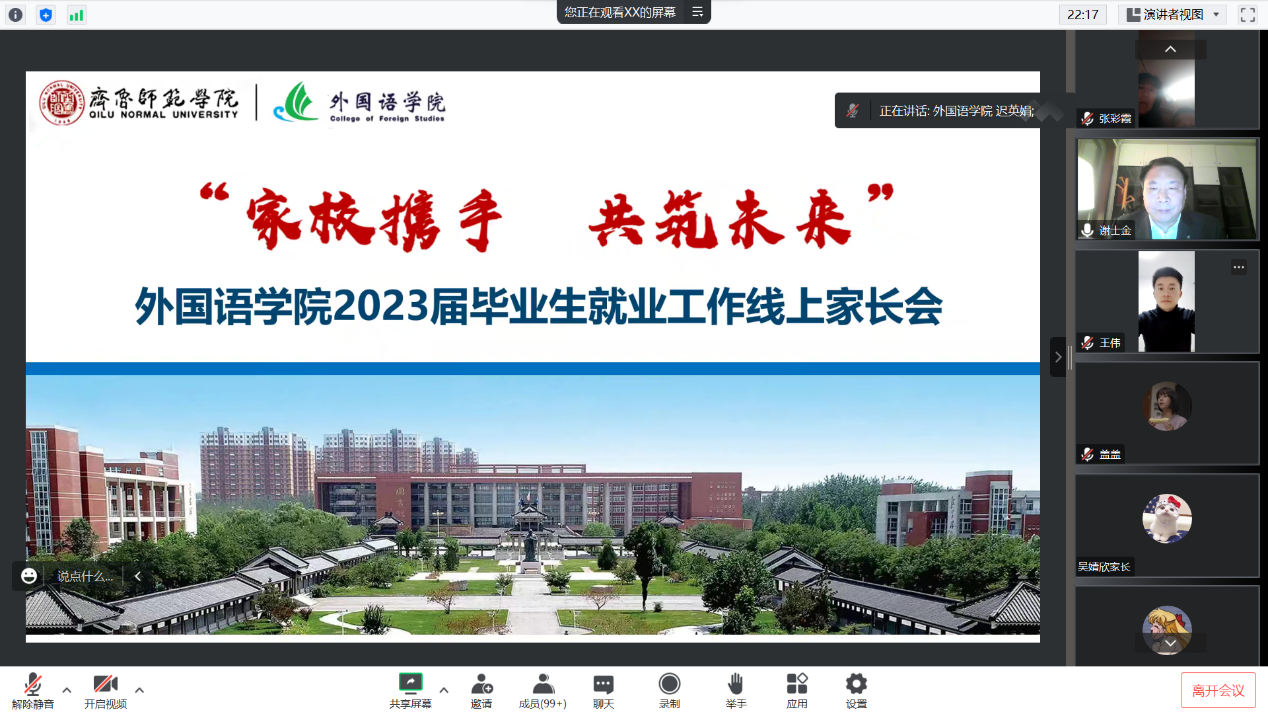 本次毕业生家长会是外国语学院推进2023届毕业生就业工作的重要举措之一,就业工作线上家长会的召开促进了家校联动,营造了全员育人的良好氛围,为高效推进2023届毕业生就业工作奠定了坚实基础。