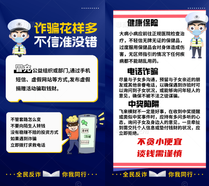 首先,我们准备了宣传资料,包括防诈骗宣传册、海报和小折页,内容涵盖常见的电话诈骗、网络诈骗、微信诈骗等多种类型,详细介绍了防范措施和应对方法。