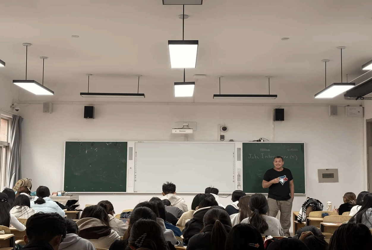 为切实提升学生在真实求职场景中的英语综合应用能力,外国语学院于10月30日下午在二教B214教室成功举办了第二十一期外教英语角活动。本次活动以“学生如何找到合适的工作”为核心议题,特邀外教David Dee老师担任主讲嘉宾,通过沉浸式互动教学,为同学们带来了一场别开生面的职场英语交流盛宴。