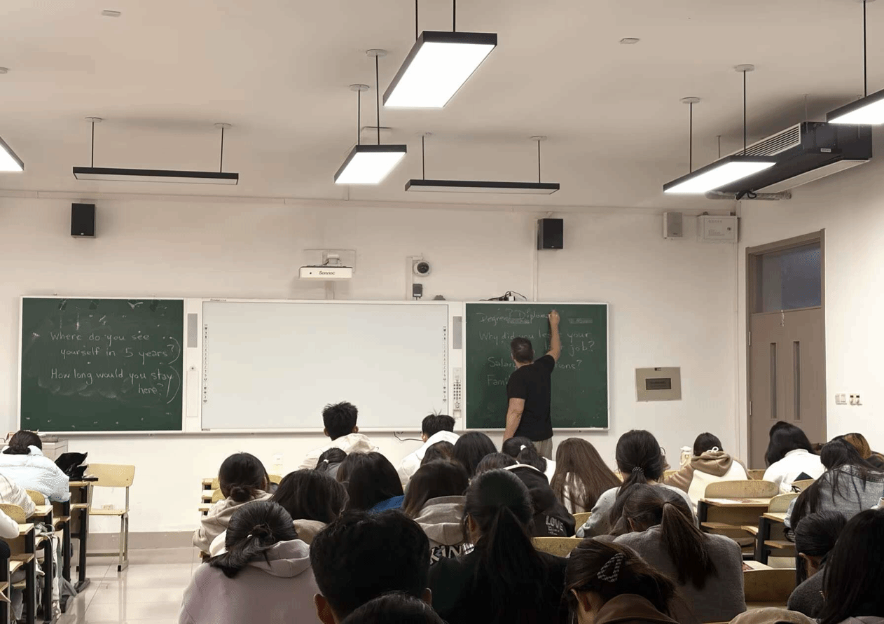 活动伊始,David Dee老师以生动有趣 的教学风格迅速吸引了同学们的注意力。他在黑板上清晰列出了“experience(经验)”“salary expectations(期望薪资)”“personality(个性)”等职场英语核心词汇,并以“job interview(求职面试)”为切入点,引导大家深入探讨“如何科学选择工作”“选择工作时应考虑哪些关键因素”等现实问题。同学们围绕“如何在面试中脱颖而出”这一话题展开了热烈讨论,纷纷提出独到见解:有的同学认为“清晰的职业规划能够充分展现个人发展潜力”,而另一些同学则强调“对目标企业的深入了解是赢得面试官青睐的关键”。整个讨论过程全程使用英语进行,不仅 有效锻炼了同学们的口语表达能力,还极大地丰富了大家的职场英语词汇量。
