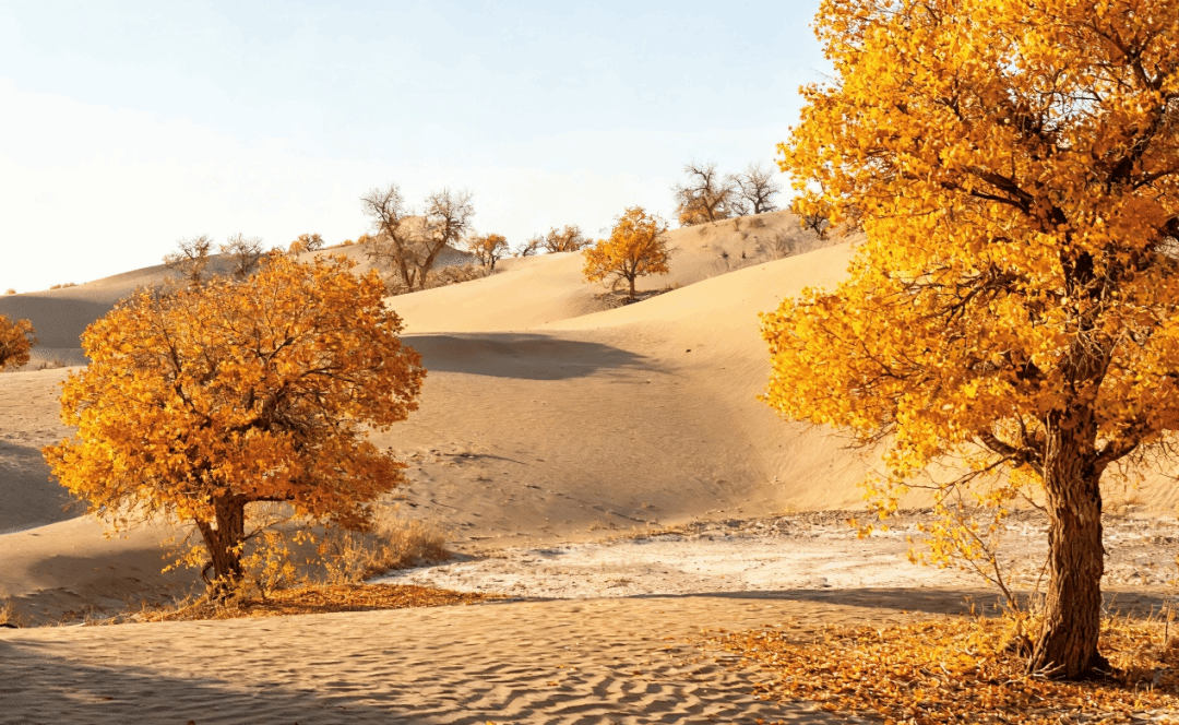 初入林场,胡杨林以它独有的风姿震撼了每一位成员的心灵。那铜铸般的枝干,奋力挣脱沙土的桎梏,昂首向天,即便躯干弯折,亦不失其挺拔之姿;枝杈繁密,于蓝天之下勾勒出一幅幅苍劲有力的画卷。金黄的叶片在微风中轻轻摇曳,仿佛在低语胡杨与黄沙千年相伴的传奇。阳光斑驳,透过枝叶的缝隙,在沙地上洒下点点光斑,为这片苍茫大地平添了几分灵动与生机。