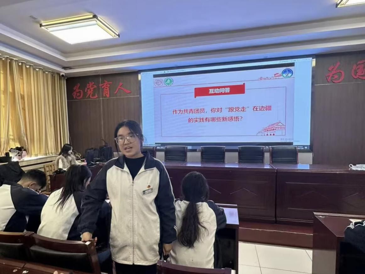 在交流分享环节,麦盖提县实验中学的团员代表们结合家乡的发展变化,纷纷敞开心扉,分享了自己的感悟与心声。“跟党走,不仅仅是一句口号,它体现在家乡通电通路时乡亲们的喜悦笑容中,体现在老师们扎根新疆、教书育人的无私奉献里。”一位团员的发言质朴而真挚,引起了在场所有人的共鸣。另一位团员则满怀激情地表示,作为新时代的边疆青年,要以胡杨精神为指引,将根深深扎在祖国边疆的土地上 ,用所学知识为家乡的建设贡献自己的力量。