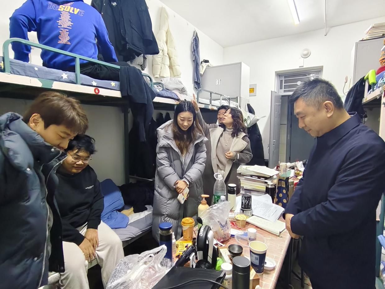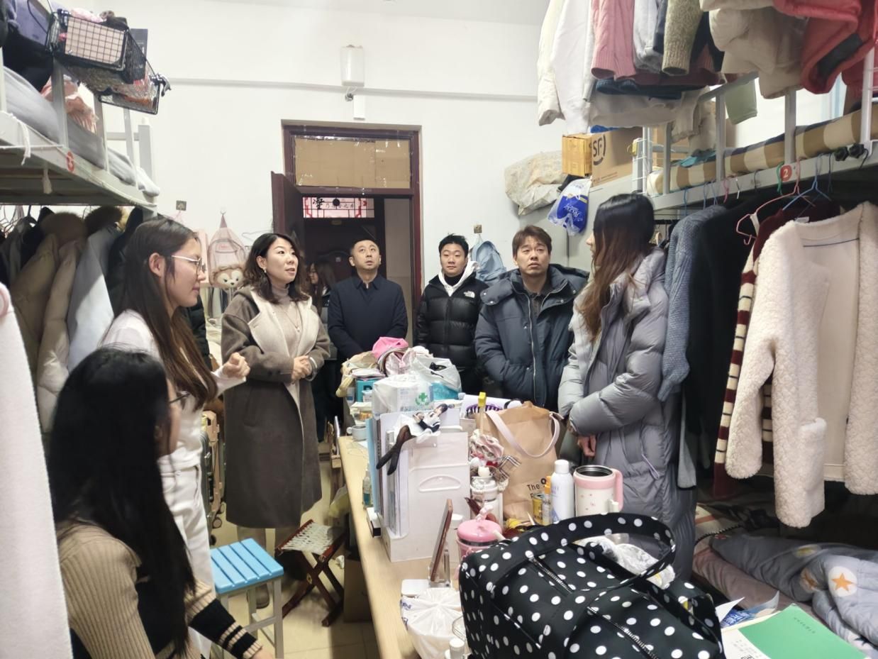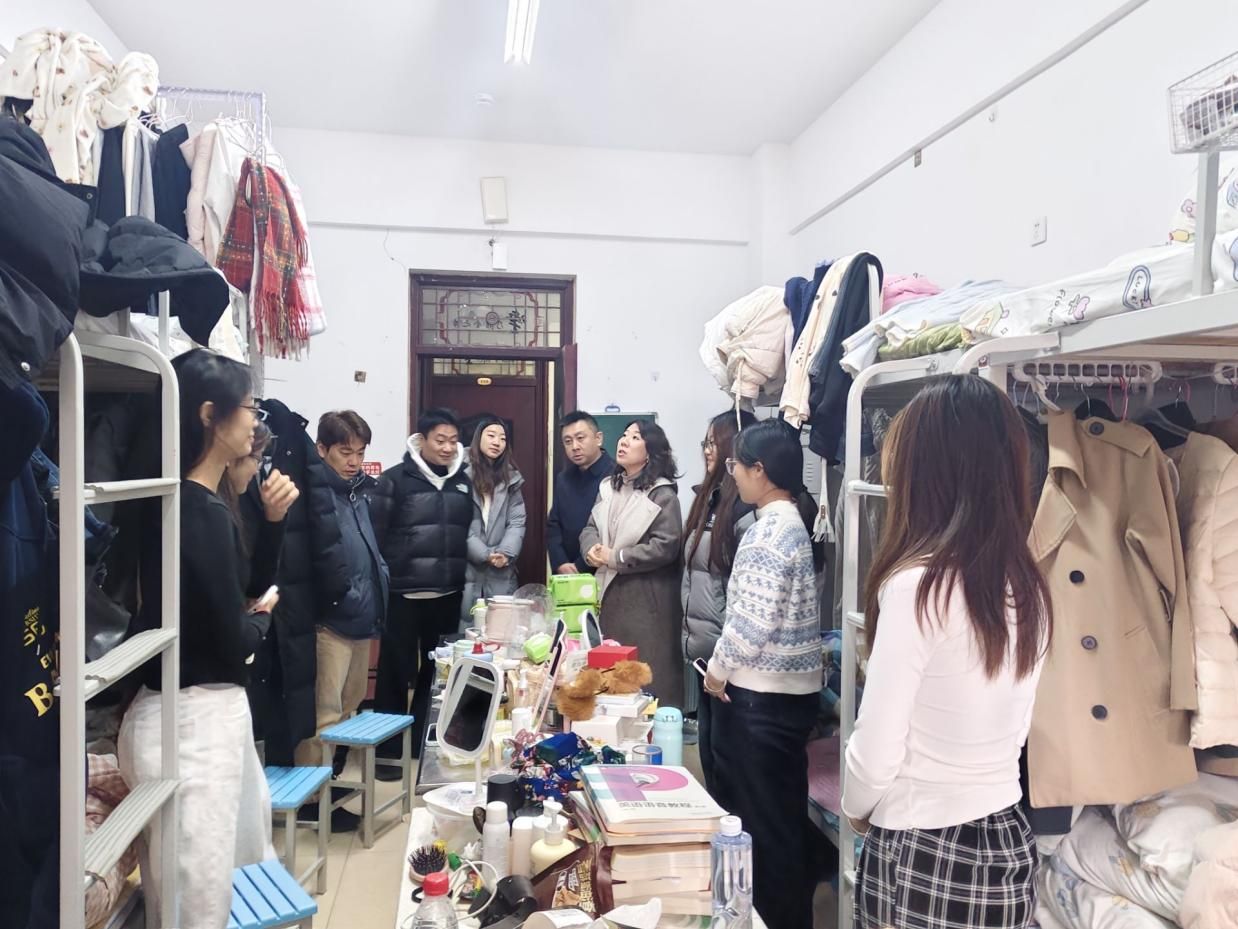 为扎实推进学生宿舍安全规范管理与文明校园建设,切实保障冬季学期学生住宿安全,营造安全、整洁、有序的居住环境,12月12日,外国语学院组织开展冬季学生宿舍安全专项排查工作。学院党委书记于江,党委副书记迟英娟,团总支书记牛荦,辅导员吴昊、高晨轩带队深入各年级学生宿舍,开展安全检查与暖心指导。