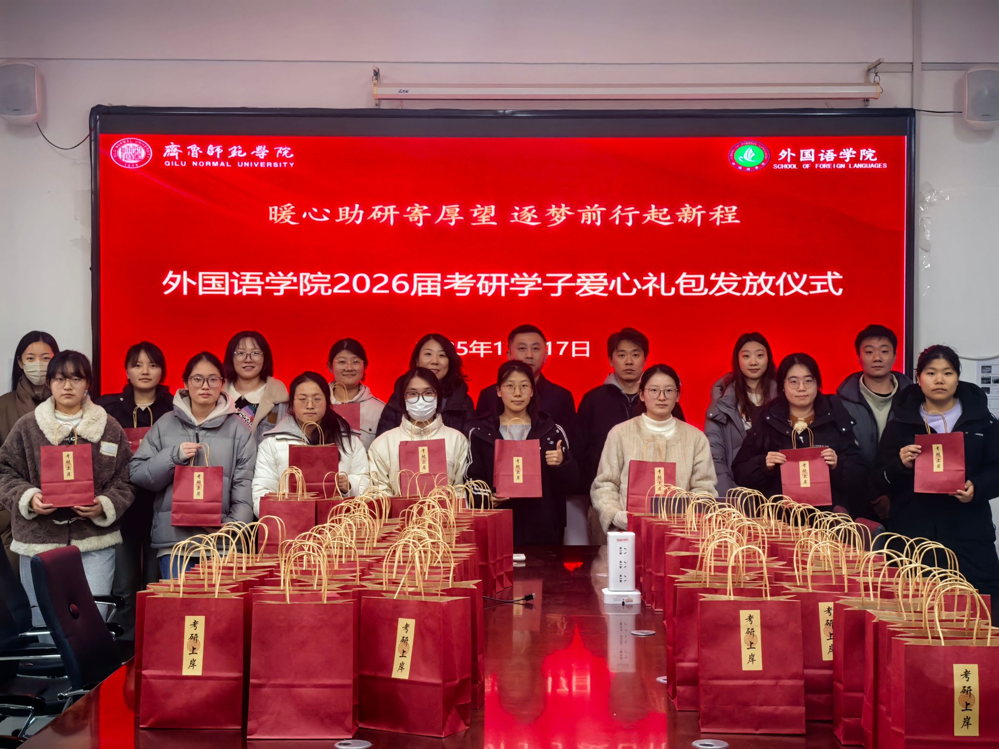考研临近之际,为切实缓解2026届考研学子的备考压力,为逐梦路上的他们注入温暖力量,12月17日,外国语学院隆重举行“考研爱心礼包”发放活动。一份份满载关怀的礼包、一句句情真意切的祝福,为即将奔赴考场的学子们保驾护航,助力他们以昂扬姿态冲刺理想彼岸。