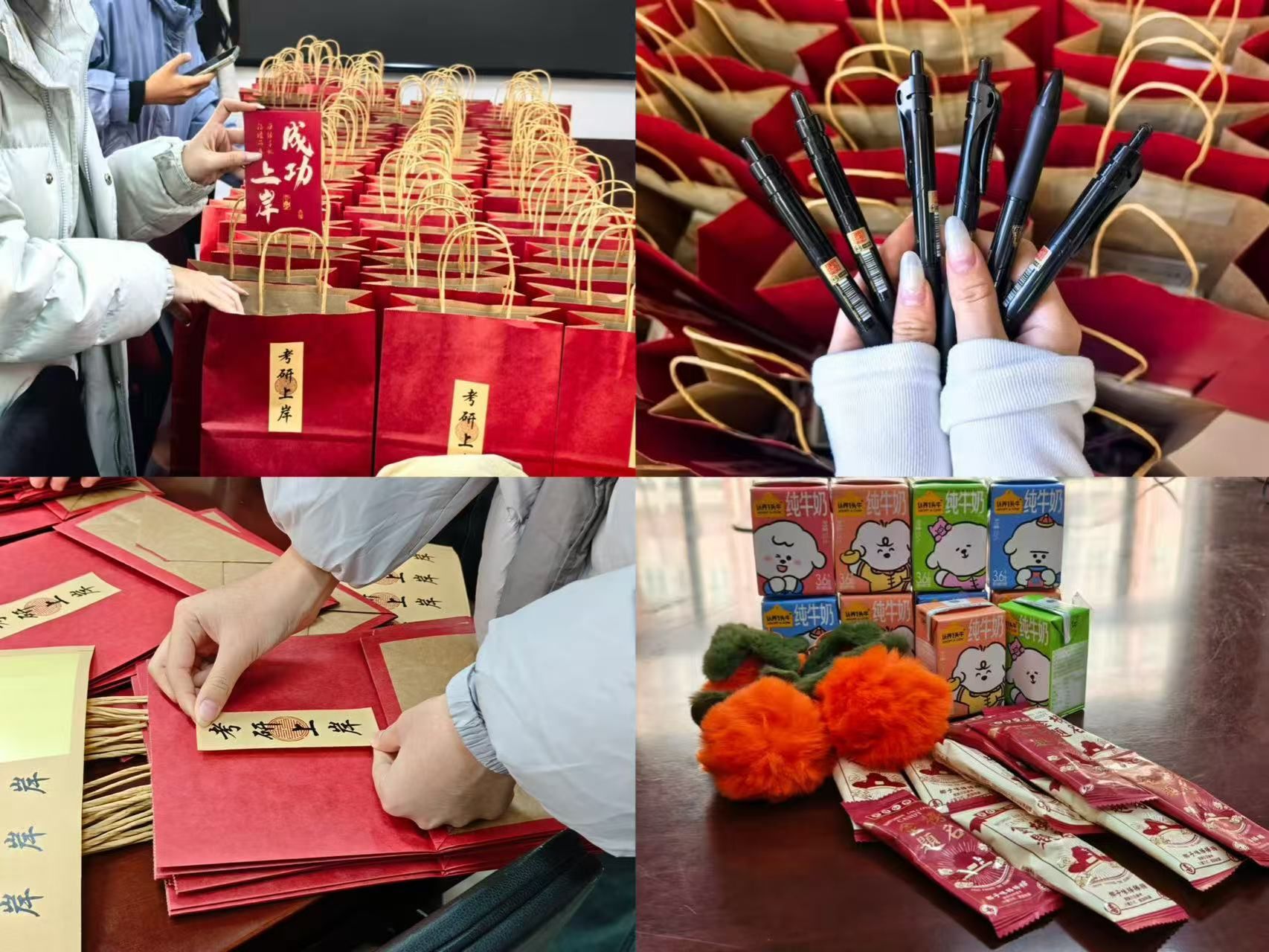 本次精心筹备的“考研爱心礼包”暗藏巧思,每一份都承载着学院的深切期许:“好柿发生”小挂件寄托顺遂吉祥的美好祝愿,精致雅笔助力学子笔下生辉、书写无悔答卷,营养牛奶为冲刺时光续航赋能,脆升升薯条寓意学业顺遂、前程向好,更有志愿者手写便签,字里行间满是“一战成硕”“成功上岸”的真挚鼓励,让温暖直抵人心。