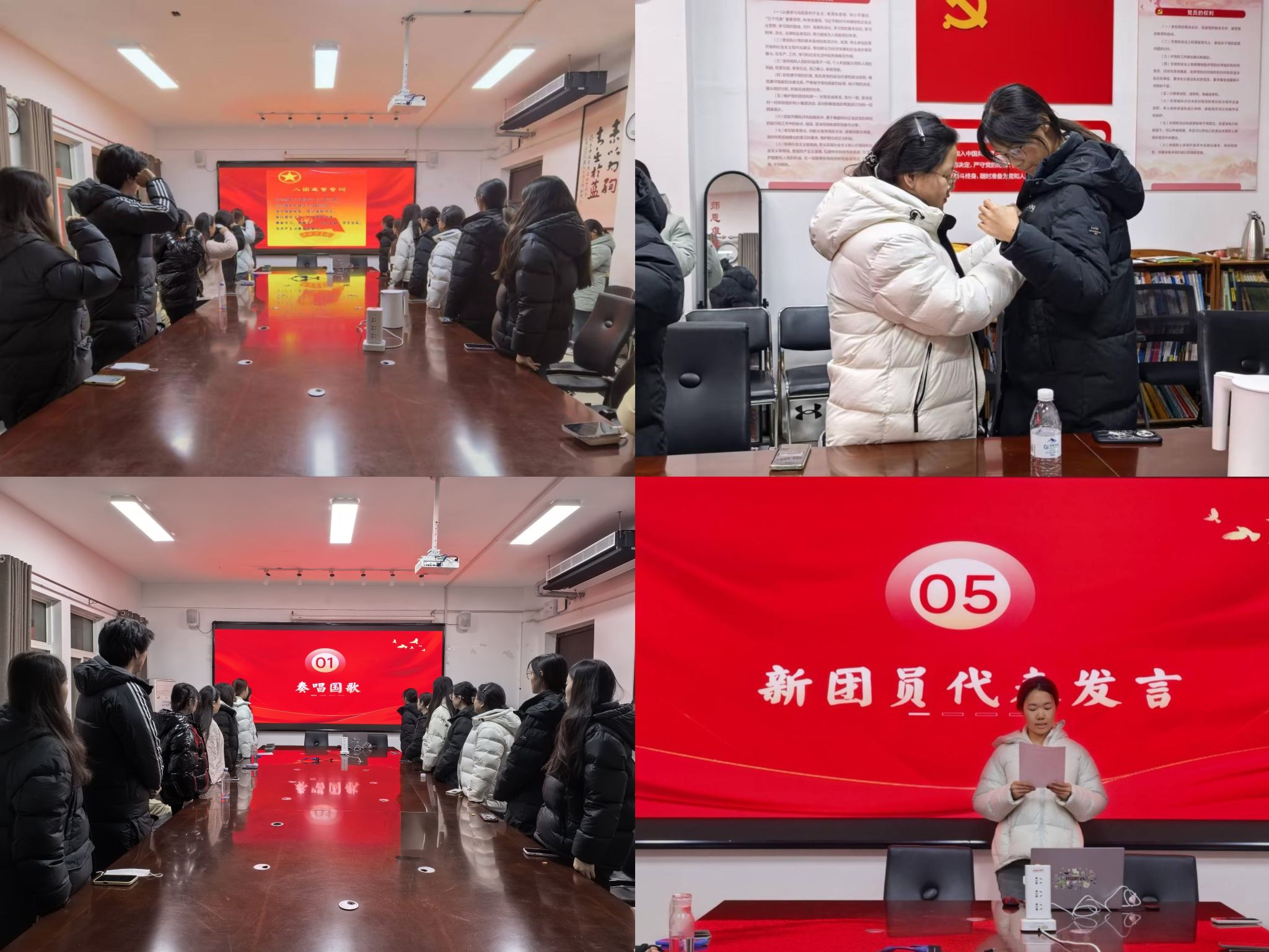 雄壮的国歌声中,入团仪式正式拉开帷幕。新团员依次互相佩戴团徽,徽章闪烁胸前,象征青春的责任与荣光。随后,在臧雪同学领誓下,全体新团员庄严宣誓,誓言铿锵,信念坚定。接着,新团员上台庄严获颁团员证,此证不仅是身份象征,更是砥砺奋进的使命寄托。随后,团员代表马鑫泓同学发言,表达了加入组织的振奋之情与未来恪守团员标准、勤学笃行、担当使命的决心。仪式最后,全体新团员共同学习团章核心内容,深入领会共青团的宗旨、使命与团员义务,进一步筑牢团员意识。