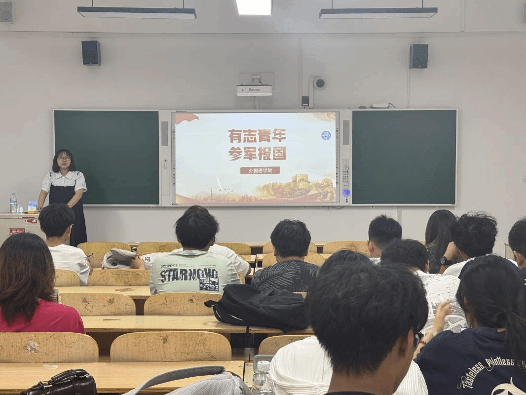 “青春因奋斗而精彩,人生因军旅而升华。”刘欣欣老师的精彩讲解有效提升了同学们对征兵政策的认知深度,进一步筑牢了大家投身国防的理想信念。未来,外国语学院将持续创新国防教育形式,发挥外语专业优势讲好强军故事,鼓励更多青年学子将个人理想融入强军实践,为国防现代化建设注入青春动能。