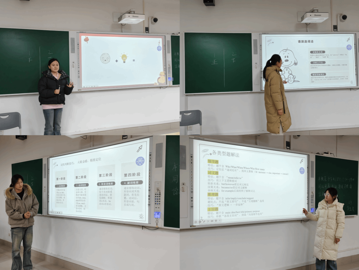 活动伊始,李庭萱同学以趣味十足的“看图猜词”互动开场,迅速点燃现场氛围,有效调动了同学们的词汇储备与参与热情。随后,石莹、薛乐乐、亓心、张萌倩四位分享者紧扣期末备考重点,依次登台传经送宝:石莹详解高频词汇高效记忆策略,帮助同学们突破词汇积累瓶颈;薛乐乐拆解阅读理解深度解题技巧,针对细节题、推理题、主旨题等题型给出精准应对方法;亓心系统讲解写作框架构建逻辑,分享实用模板与高分亮点表达;张萌倩聚焦完形填空与语法填空核心考点,提炼词性判断、上下文分析等关键解题思路。四位分享者的讲解条理清晰、干货满满,直击应试痛点,为同学们提供了极具针对性的备考指导。