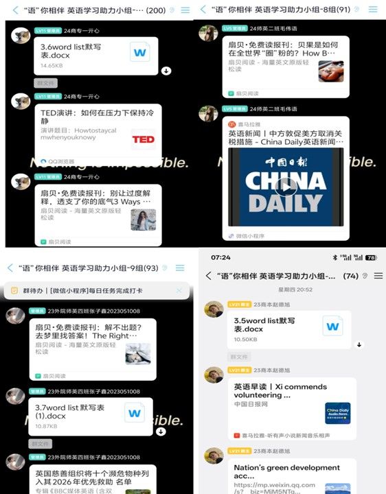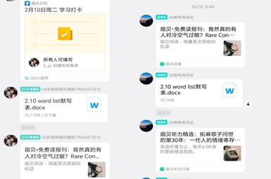 本次帮扶活动覆盖寒假全周期,依托线上学习群搭建专属帮扶平台,辅导团成员每日精心规划并发布针对性学习任务,以单词英汉互译基础练习为核心,同步推送优质英语阅读素材、经典朗读音频、热点英文资讯等多元学习资源,为不同学习需求的同学提供丰富选择。活动过程中,辅导团全程做好学习督促与答疑指导,同学们踊跃参与、积极打卡,每日按时完成学习任务并上传打卡记录,不少同学还主动在群内分享学习心得、交流实用英语表达,形成了比学赶超、互帮互助的浓厚线上学习氛围,参与打卡人次逐日攀升,帮扶成效显著。