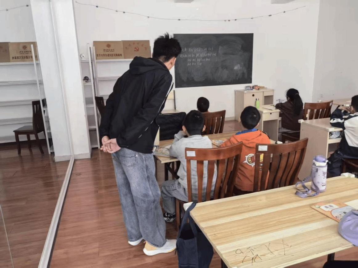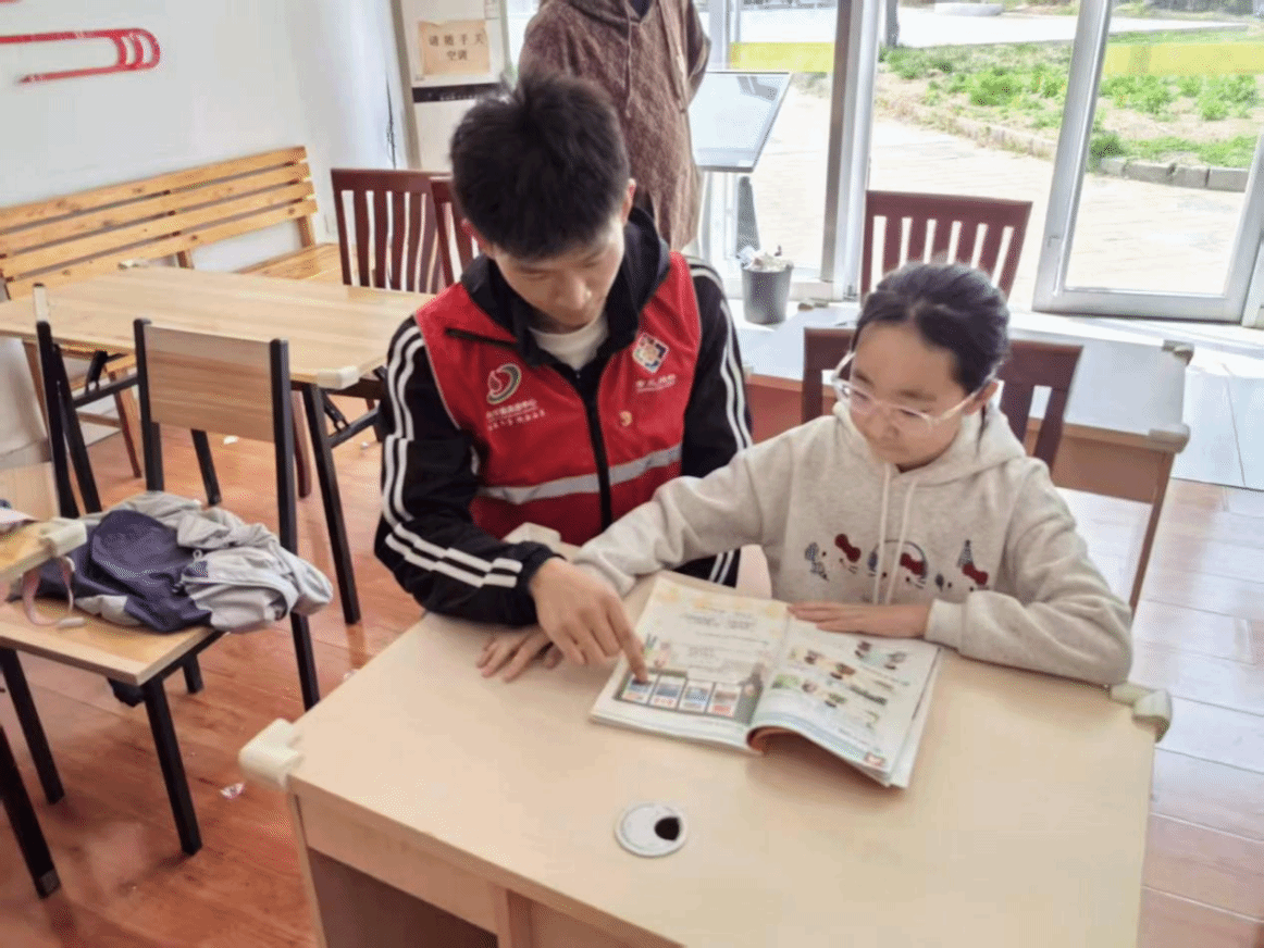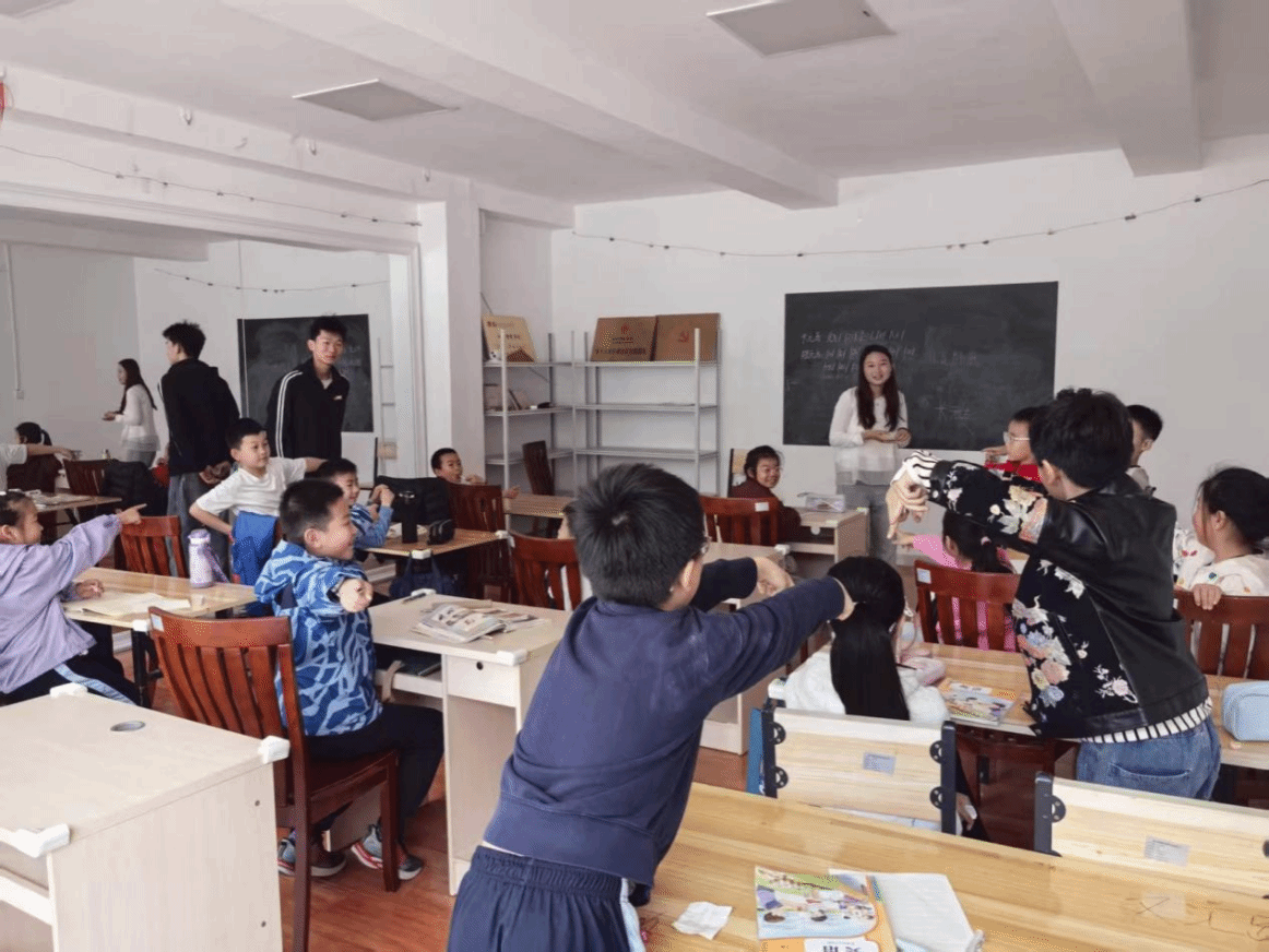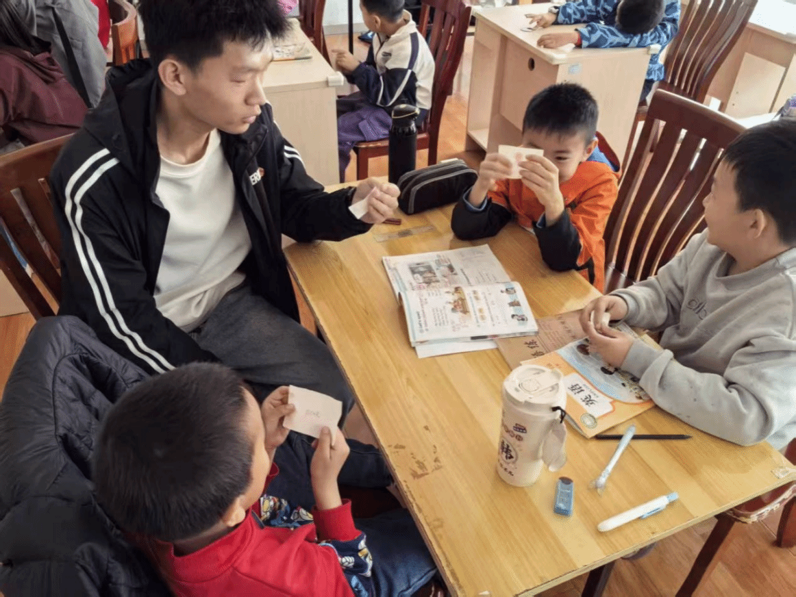 知识讲解结束后,王思齐一对一陪伴孩子们完成课后作业,针对孩子们遇到的疑难问题细细讲解、慢慢梳理,帮助大家巩固课堂所学,夯实英语学习的基础。课间的时光总是充满欢乐,肖凡林和孩子们围坐在一起做游戏,嬉笑打闹间,彼此的距离越拉越近,教室里的每一个角落,都洋溢着欢快的气息。