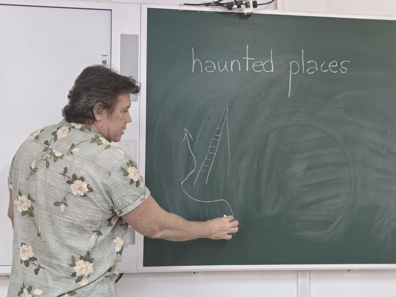 活动伊始,David Dee老师先在黑板上梳理出“ESP(超感官知觉)”“psychics(灵媒)”“clairvoyance(千里眼)”等核心词汇,并以“Superstition(迷信)”为切入点,引导大家围绕“lucky charms(幸运符)”“lucky numbers(幸运数字)”“haunted places(闹鬼之地)”等话题展开深度讨论。