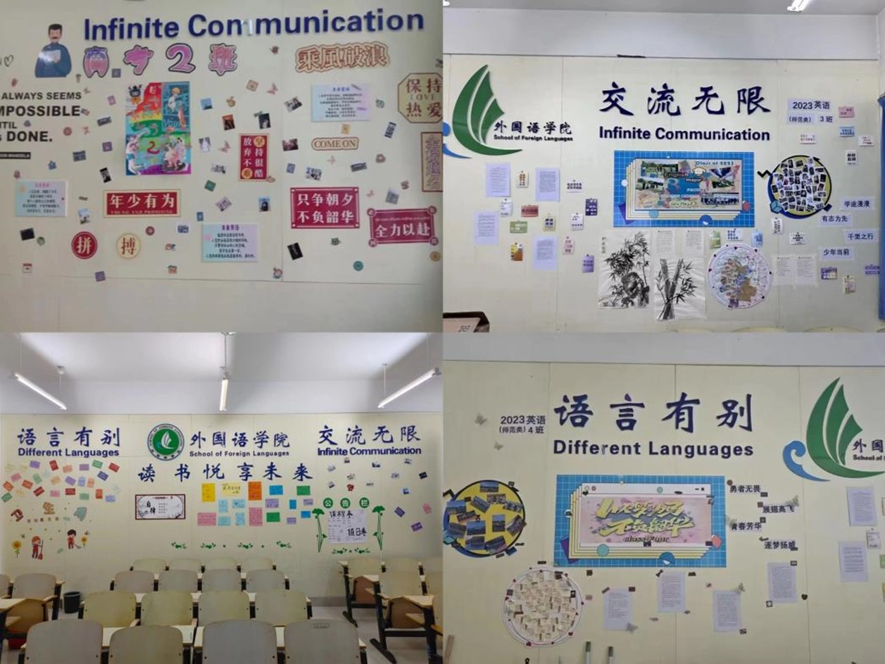 秉承“语言有别,交流无限”院训,为营造和谐融洽、积极向上、富有特色的班级文化氛围,学院开展了班级文化墙建设活动。班级文化墙的设计也是亮点纷呈,作为展示班级个性文化的平台,每个班级都选择了具有代表性的元素。各班同学们认真思考、积极行动、巧妙构思、精心布置,通过制作手抄报、张贴优秀作业、班级合照等多种方式,营造出了一个个主题鲜明、色彩和谐又各具特色的班级文化氛围,将班级的特色和风采展现得淋漓尽致。