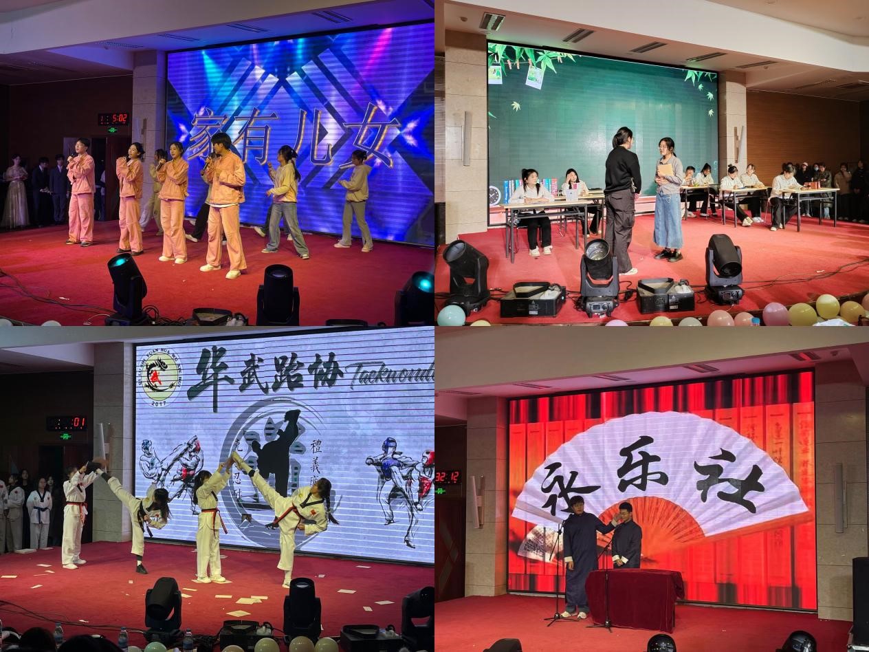 致辞过后,晚会正式拉开帷幕。歌曲《飘向北方》《花儿与少年》《别怕变老》《微微》以优美的歌声和动人的旋律点燃了晚会的氛围;小品《骗骗就是你》《上学那些事儿》以诙谐幽默的语言和夸张生动的表演,将生活中的点滴趣事展现得淋漓尽致,引得在场观众捧腹大笑;舞蹈表演《舞力觉醒》、KPOP串烧《CSLG》《舞之悦》燃爆全场,舞姿极具动感和张力,诠释着青春的热情和无尽的活力;同样,古典舞蹈《鱼跃江南》如梦幻般的舞姿,给人一种无法言喻的美感;相声《快乐健身》妙趣横生,演员妙语连珠为观众带来出其不意的欢笑;竹笛独奏《扬鞭策马粮忙》轻快悦耳,悠扬缠绵,观众都沉醉其中;跆拳道表演《燃烧吧青春》炫酷招式,凌空翻腾,跆拳道特技展现出令人震撼的力量;除了这些精彩绝伦的节目表演外,游戏互动环节也备受欢迎,在场的观众积极参与,营造了轻松又活跃的现场,为整个晚会增添了一抹亮丽的色彩。晚会尾声,全体辅导员携手合唱《相亲相爱一家人》,群情激奋,尽显深情厚谊,现场爆发出热烈掌声,同学们一起大合唱,气氛达到了高潮。