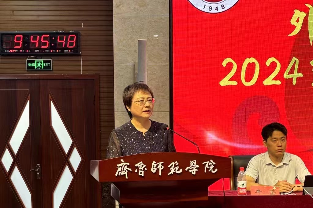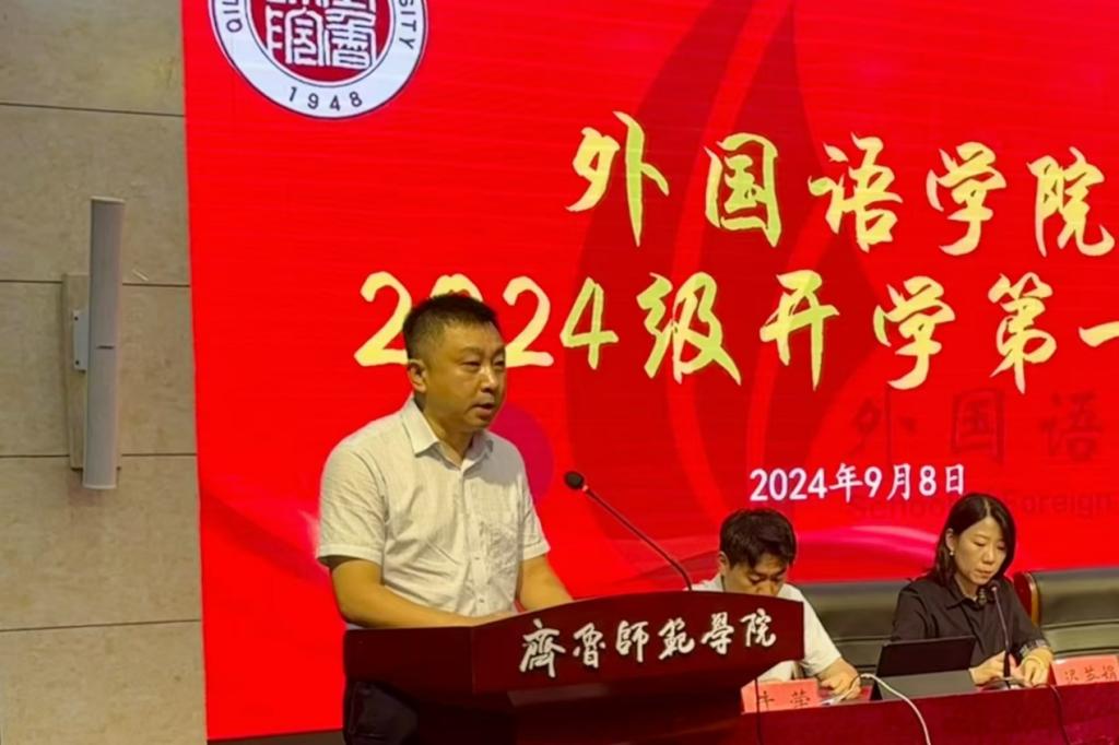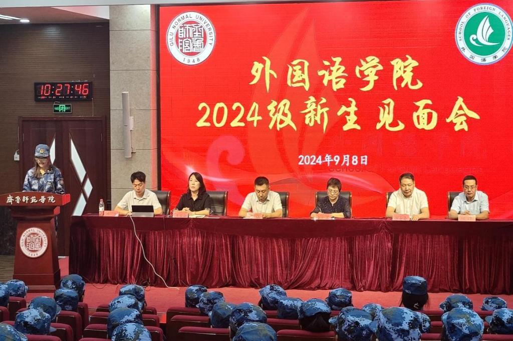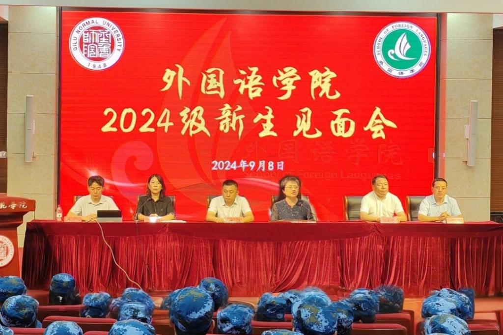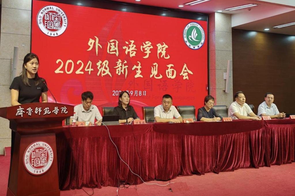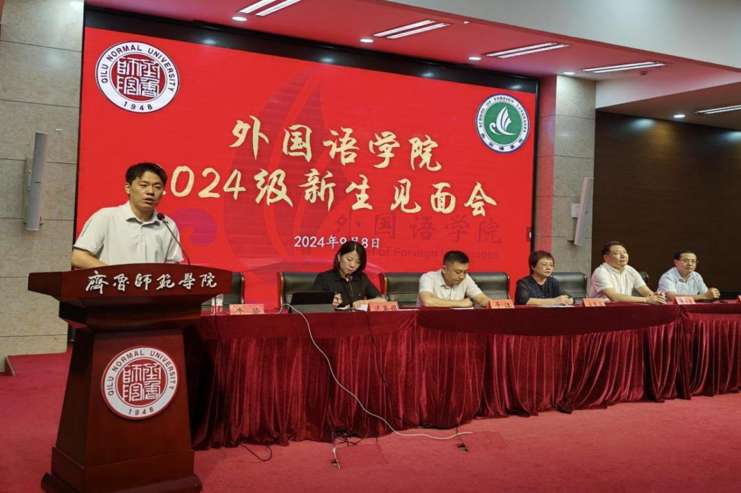 乘风远航新启程,戮力同心向未来。为帮助2024级新生更好地融入大学生活,顺利开启新征程,增进他们对学校和学院的了解。外国语学院于9月8日在章丘校区图书馆学术报告厅隆重举行2024级新生见面会。外国语学院院长宋秀葵,党委书记于江,副院长谢士金、陈锋,党委副书记迟英娟,团总支书记牛荦,辅导员刘欣欣、王凯、吴昊,2024级新生班主任,以及2024级全体学生参加会议。会议由迟英娟主持。