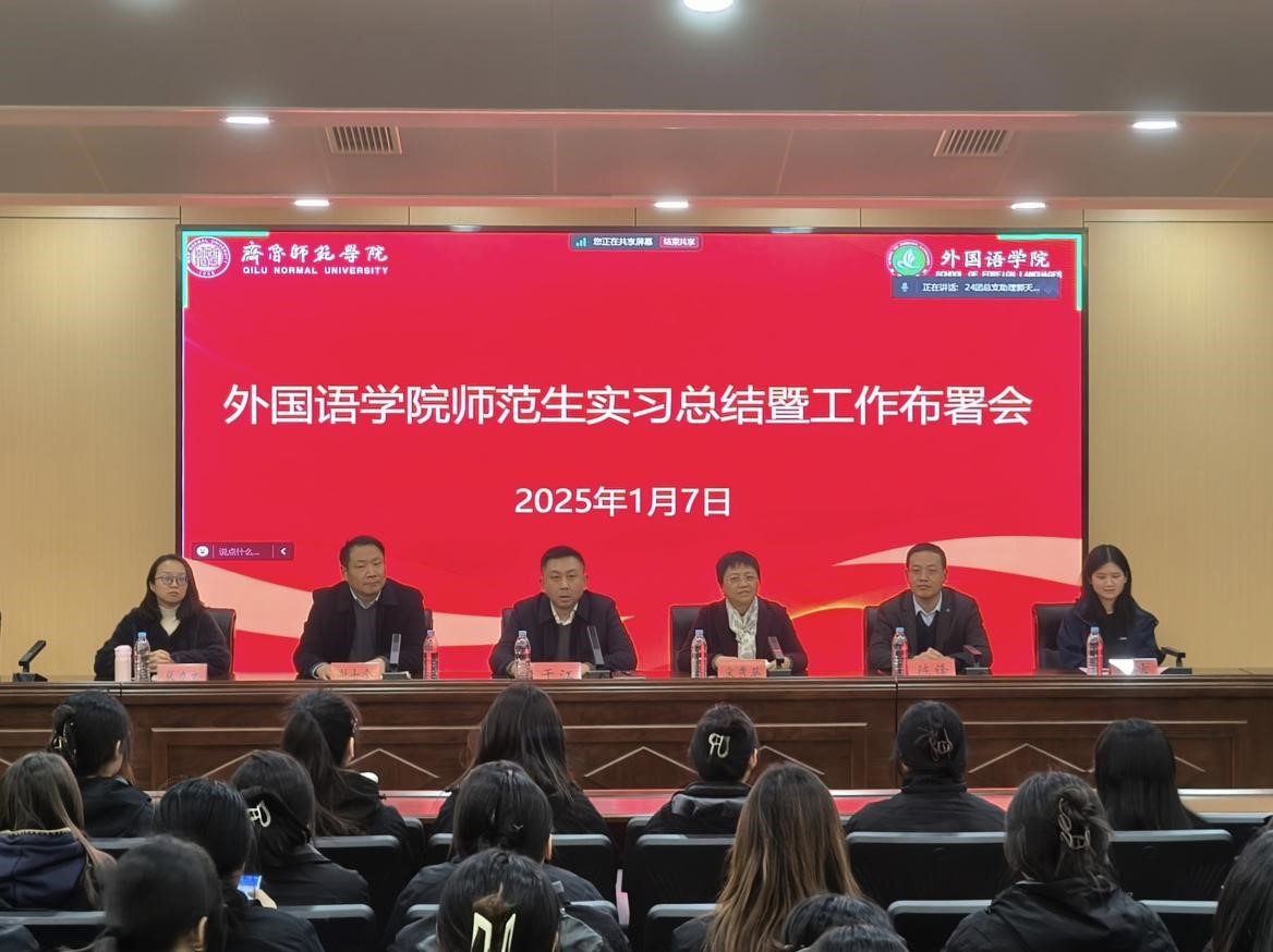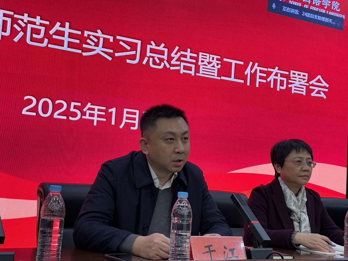 为全面总结2024年度师范生教育实习工作,布署寒假及新学期工作,外国语学院于1月7日在第二学术报告厅举行了师范生实习总结暨工作部署会。外国语学院院长宋秀葵、党委书记于江、副院长谢士金、陈锋,教研室主任张力文,赴疆实习支教带队教师汪洁出席会议,全体赴新疆支教的师范生、在省内其他地市实习的师范生参加会议,会议由外国语学院院长宋秀葵主持。