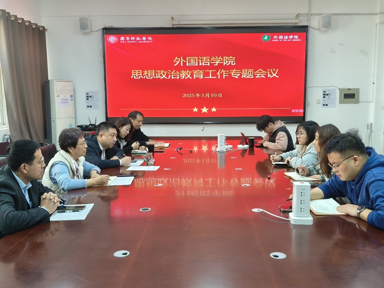 为深入学习贯彻习近平新时代中国特色社会主义思想和党的二十大、二十届三中全会精神,全面贯彻党的教育方针,巩固深化思政教育成果,外国语学院党委于3月10日上午召开思想政治教育工作专题会议。学院党政班子成员和全体辅导员参加会议。会议由学院党委书记于江主持。